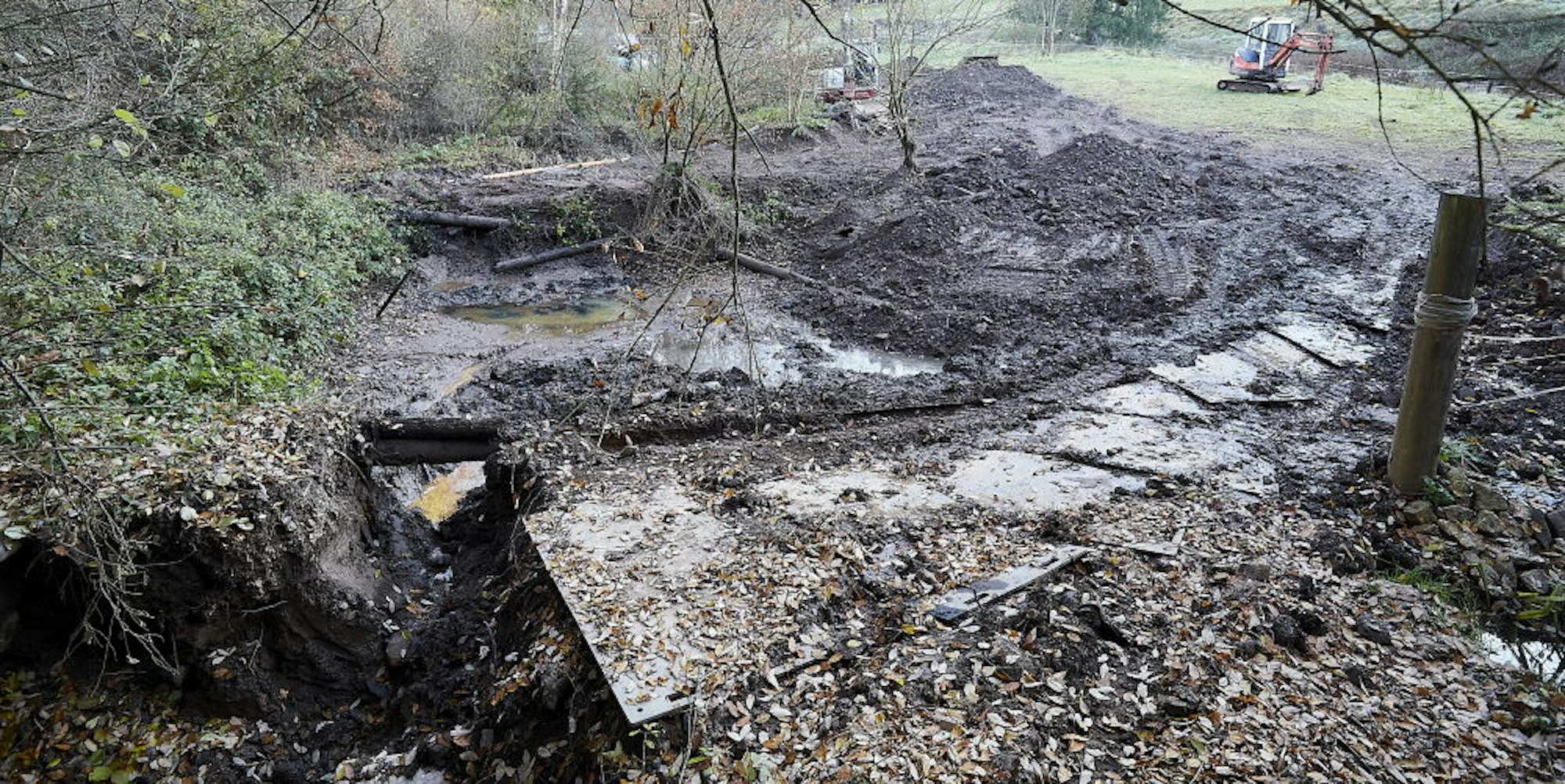 Während der Arbeiten habe man eine Quelle entdeckt, die jemand mit einem Stück Rohr und alten Autoreifen umgeleitet habe. Darauf habe der Unbekannte dann Bleche und Balken gelegt und den Bereich anschließend mit Erde abgedeckt. Das habe man alles wegbaggern müssen, um anschließend einen neuen Einlauf für das Quellwasser anlegen zu können. Der Eigentümer der Teiche habe ohnehin vorgehabt, diese zu verfüllen.