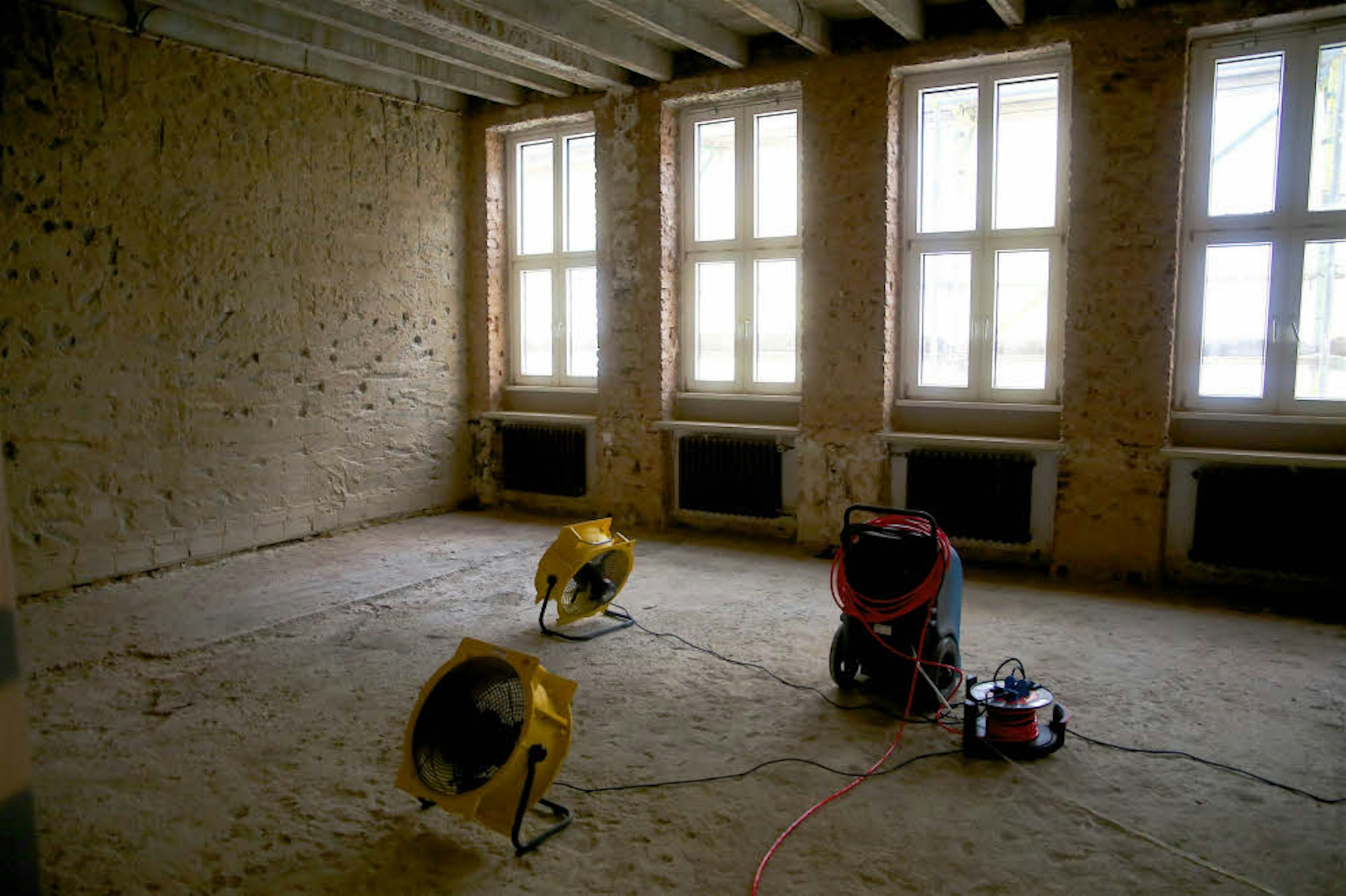 In einigen Räumen sind bereits Lüfter und Kondensat-Trockner installiert. Die Crew der Firma Belfor hat in den vergangenen Wochen ganze Arbeit geleistet – und wird nach Einschätzung von Harry Dietrich, bei der Stadt fürs technische Immobilienmanagement zuständig, noch ein paar Monate zu tun haben. Die Brandschaden-Sanierer werden alle Arbeiten erledigen, bis die Handwerker für den Wiederaufbau anrücken können.