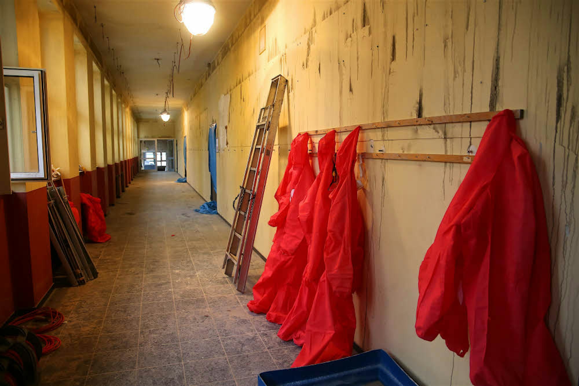 Der von den Bränden und durch das eingedrungene Löschwasser schwer beschädigte A-Trakt des Gymnasiums ist vom Rest der Schule abgeschottet. Laut Wolter ist der Trakt zu 80 Prozent von Löschwasser durchfeuchtet und kontaminiert. Im einstigen Verwaltungstrakt hat sich bereits viel getan: Es stehen nur noch die nackten Wände – Einrichtung, Deckenverkleidungen und Bodenbeläge sind entsorgt. Das Gros der rötlichen Hohlkammerziegel ist vor Nässe dunkel.