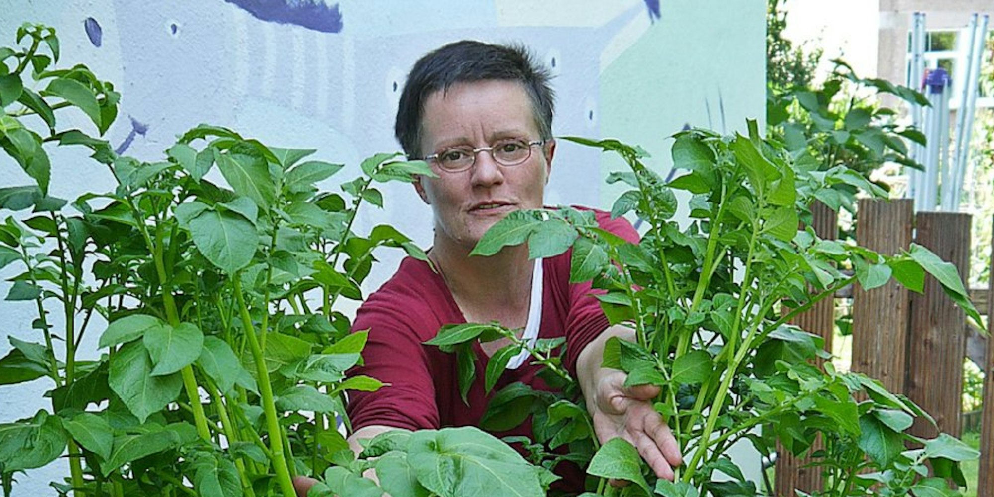 Kaum noch zu sehen vor lauter Blättern: Verena Bartoniczek mit ihrem Kartoffelturm.