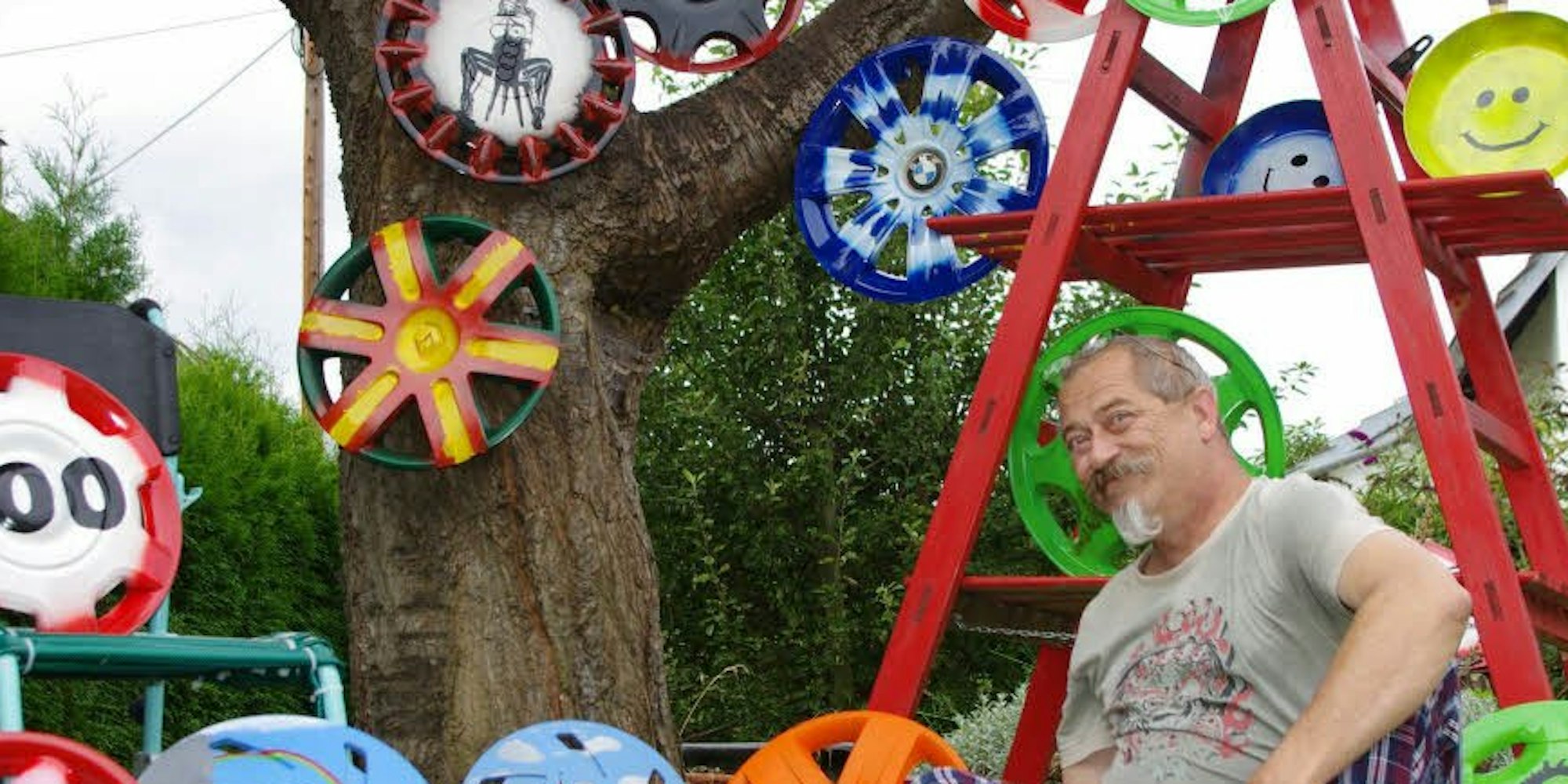 Rettet die Radkappen: Was andere nicht mehr brauchen, bemalt Aktionskünstler Uwe Rhiem liebevoll mit bunten Motiven.