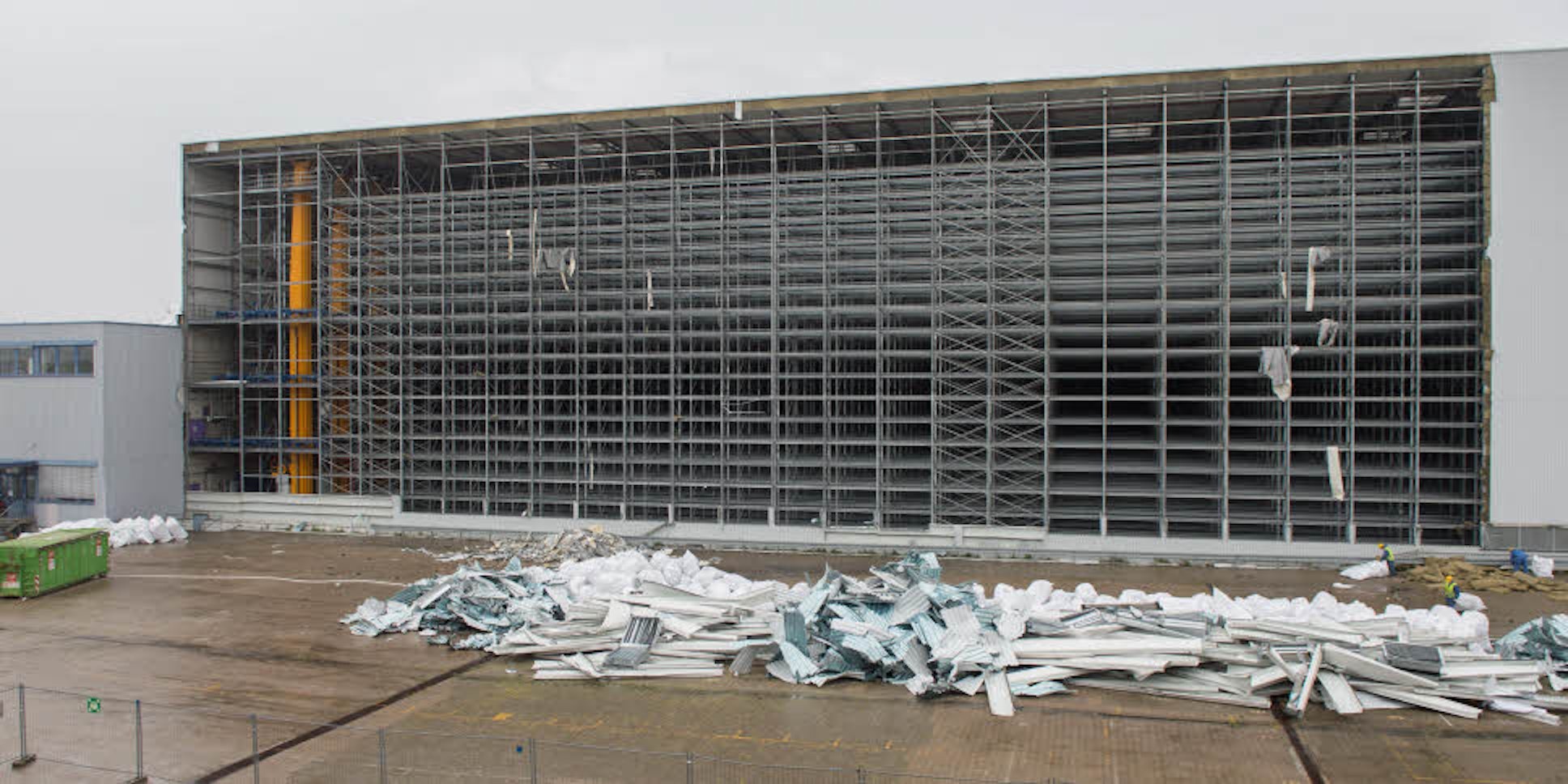 Große grüne Container stehen auf der Freifläche vor der Südseite des ausgedienten Logistikzentrums, in dem vor Jahren vor allem Handys der Telekom gelagert wurden. Fast die komplette Längsseite gibt bereits einen Blick ins Innere des Hochregallagers preis. Die Wellblech-Fassade liegt in diesem Bereich schon auf einem langgezogenen Haufen. Bauarbeiter verstauen die bereits heruntergerissene Isolierung in weiße, überdimensionale Säcke.