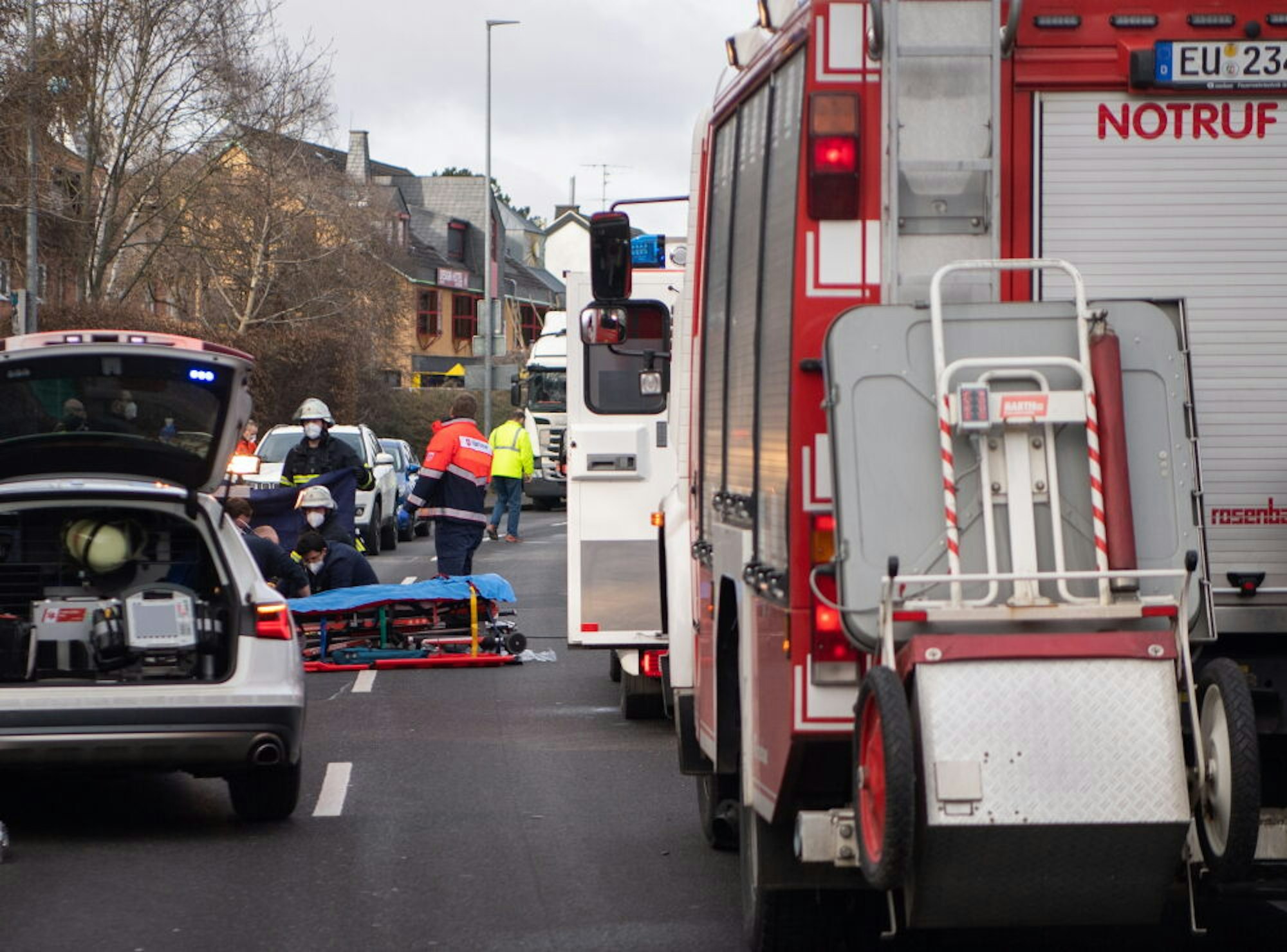 Der 41-Jährige blieb bewusstlos auf der Fahrbahn liegen. Die Rettungskräfte, die wenige Minuten nach dem Unfall an der Einsatzstelle eintrafen, begannen sofort mit der Reanimation des Schwerstverletzten. Zu den Ersthelfern gehörten auch Einsatzkräfte der Hauptamtlichen Wache. Unter der Leitung von Marco Schlösser waren insgesamt sieben Feuerwehrleute im Einsatz. Sie bauten auch einen Scheinwerfer auf. „Das machen wir bei kühlen Temperaturen, weil die Lampen Hitze abstrahlen“, erklärte Schlösser.