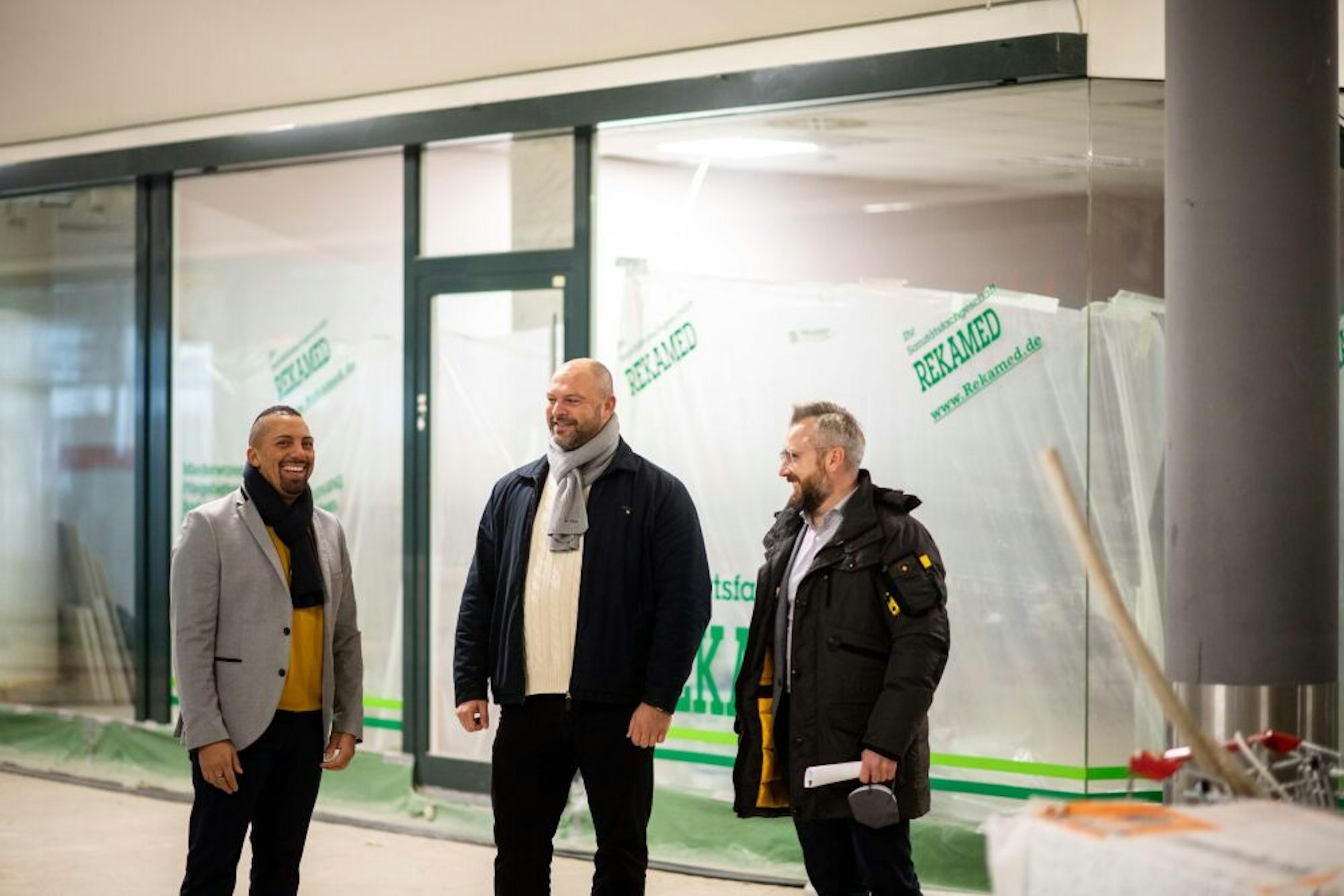 Die Euskirchener Tim Volk (l.) und Tobias Von Groote (M.) werden im Galleria einen Outlet-Klamotten-Laden eröffnen. Galleria-Besitzer Carlo Wisskirchen freut sich auf die Investoren.