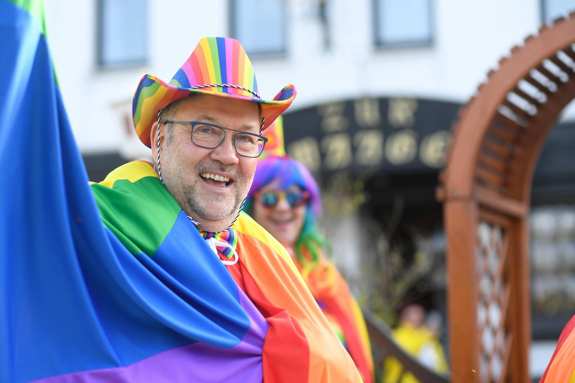 Startpunkt für die Südstädter ist die Euskirchener Waage, Stammkneipe der IG. Von da aus werfen die Jecke mit gewohnter Begeisterung Kamelle. Sogar gegen Corona schützen sie sich getreu dem Regenbogen-Motto: „Wir haben extra Masken in den Farben machen lassen“, erzählt eine Karnevalistin. Corona sei für die Gruppe „beschissen gut“ gewesen, scherzt Präsident Peter Barth: „Nein, Quatsch. Wir sind überall eingebremst worden.“ Mit aller Gewalt habe die IG aber keine Veranstaltungen aufziehen wollen. „Wir haben uns dafür mal im Sommer im Biergarten getroffen oder so“, erzählt Barth. Natürlich sei alles im Freien unter den geltenden Schutzvorschriften geschehen.