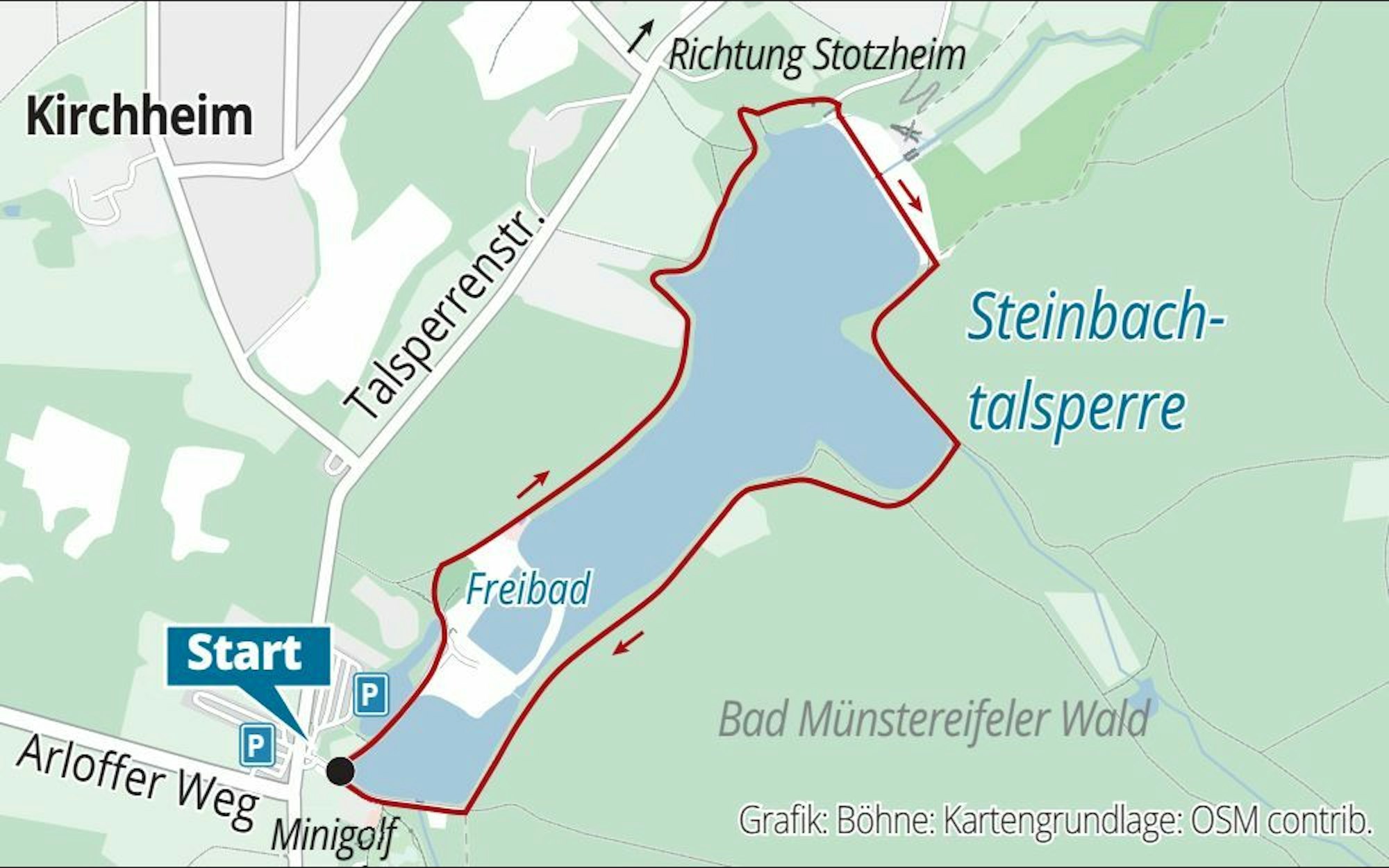 Ob Minigolf, Waldfreibad oder Abenteuerspielplatz – die Auswahl an Aktivitäten an der Strecke vor oder nach der kleinen Wanderung ist groß. Die Strecke wird von der Nordeifel Tourismus GmbH besonders für Gruppen mit Kinderwagen empfohlen, da der gesamte Streckenverlauf asphaltiert ist. Wer direkt auf dem Parkplatz an der Steinbachtalsperre (kostet am Wochenende zwei Euro) parkt, hat auf dem Weg nahezu keine Steigung. Dort beginnt die Wanderung.