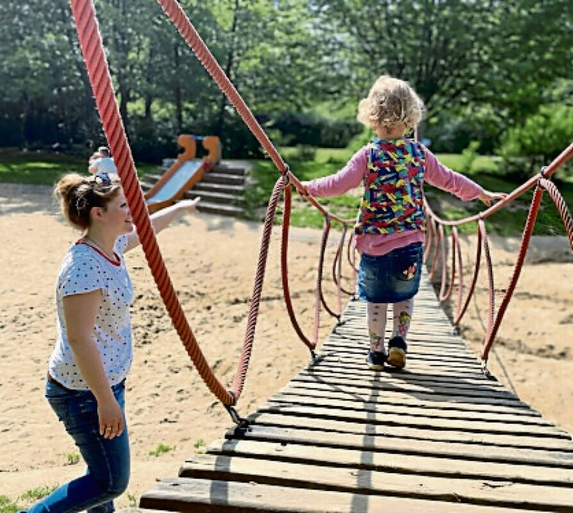 Umso besser für Maila: Die Dreijährige kann auf dem großen Spielplatz am Parkplatz alles mit ihrer Mutter ausprobieren und genießt dabei die volle Aufmerksamkeit. Erst wird auf dem Trampolin gehüpft, dann über die Seilbrücke balanciert, am Wasserspielplatz gebaggert und geschaufelt, gewippt und zum Schluss auf der großen Reifenschaukel geschaukelt. Am Ende des Ausflugs ist jeder auf seine Kosten gekommen – beim Spazieren, Spielen und Snacken.