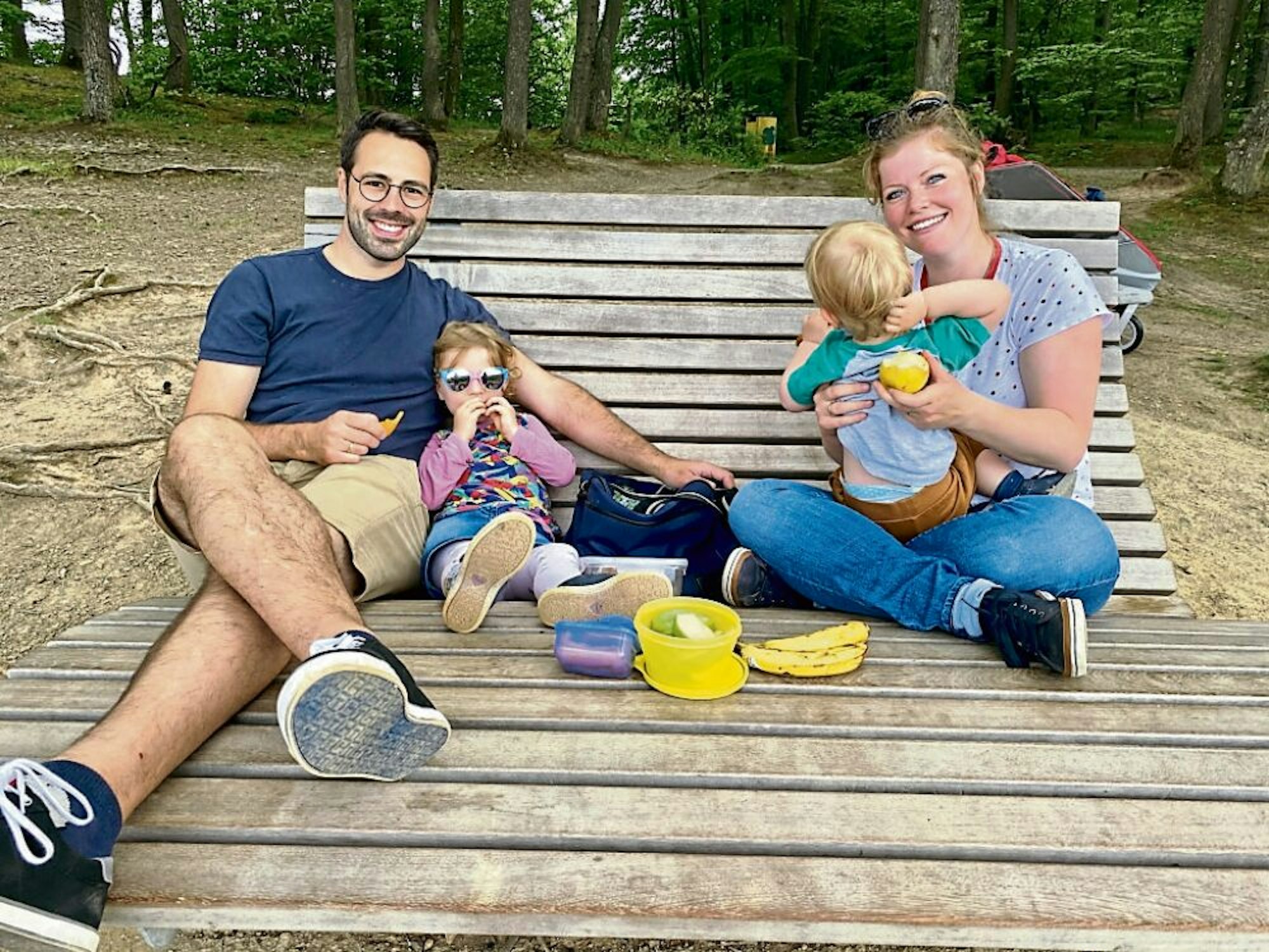 Nach der Stärkung mit Obst, Gemüse und den Geburtstagsmuffins vom Vortag geht es weiter. Endspurt ist angesagt. Und damit die Kinder nicht die Lust am Spaziergang verlieren, gibt Mama einen Hinweis. „Gleich sind wir am Spielplatz“, ruft sie. Für die Kinder ist der immer das Highlight. „Wenn wir direkt am Anfang dorthin gehen würden, bekämen wir die beiden gar nicht mehr weg“, erklärt Dreesbach. Der kleine Finn schläft auf den letzten Metern in Papas Trage ein. Die hat die Familie immer dabei für den Fall, dass der Einjährige im Kinderwagen quengelig wird oder schlafen will.