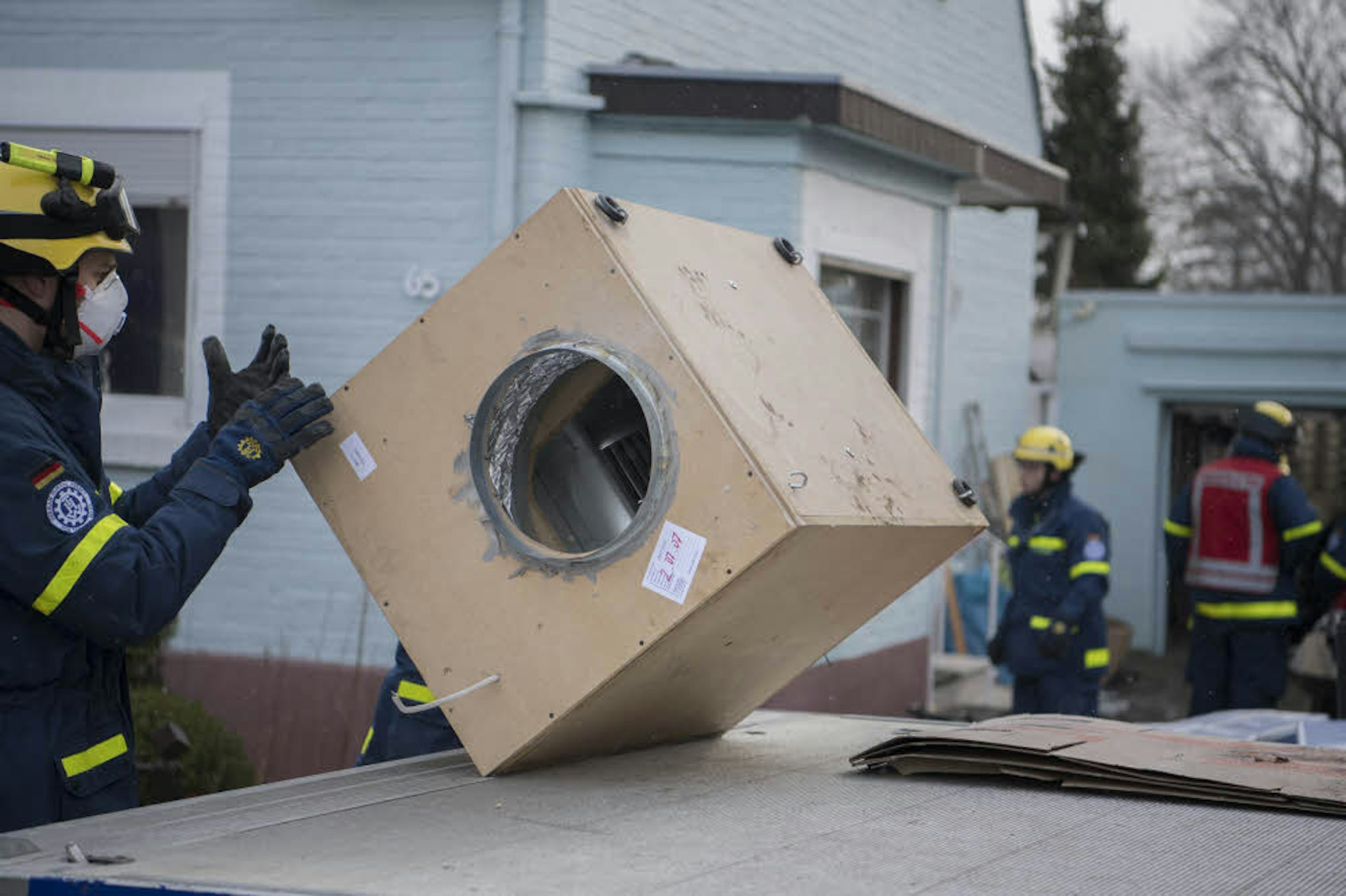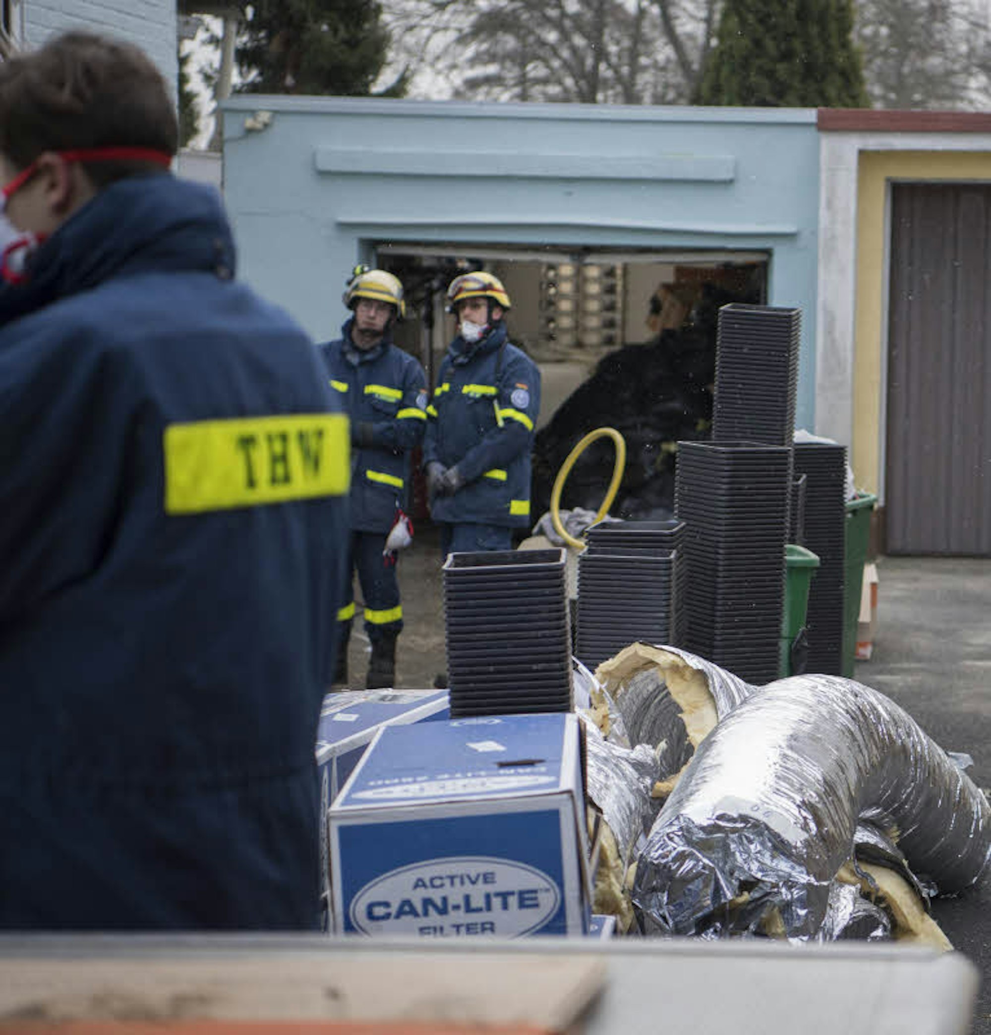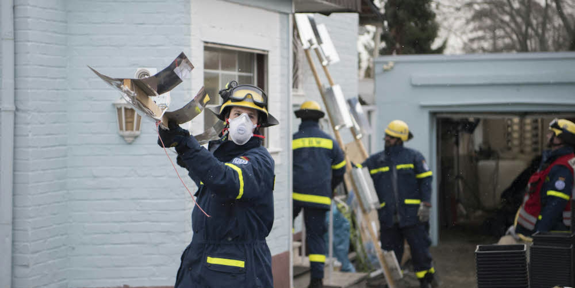 Unter Atemschutz holen die Mitarbeiter des THW UV-Lampen aus dem Einfamilienhaus in Klein-Vernich.