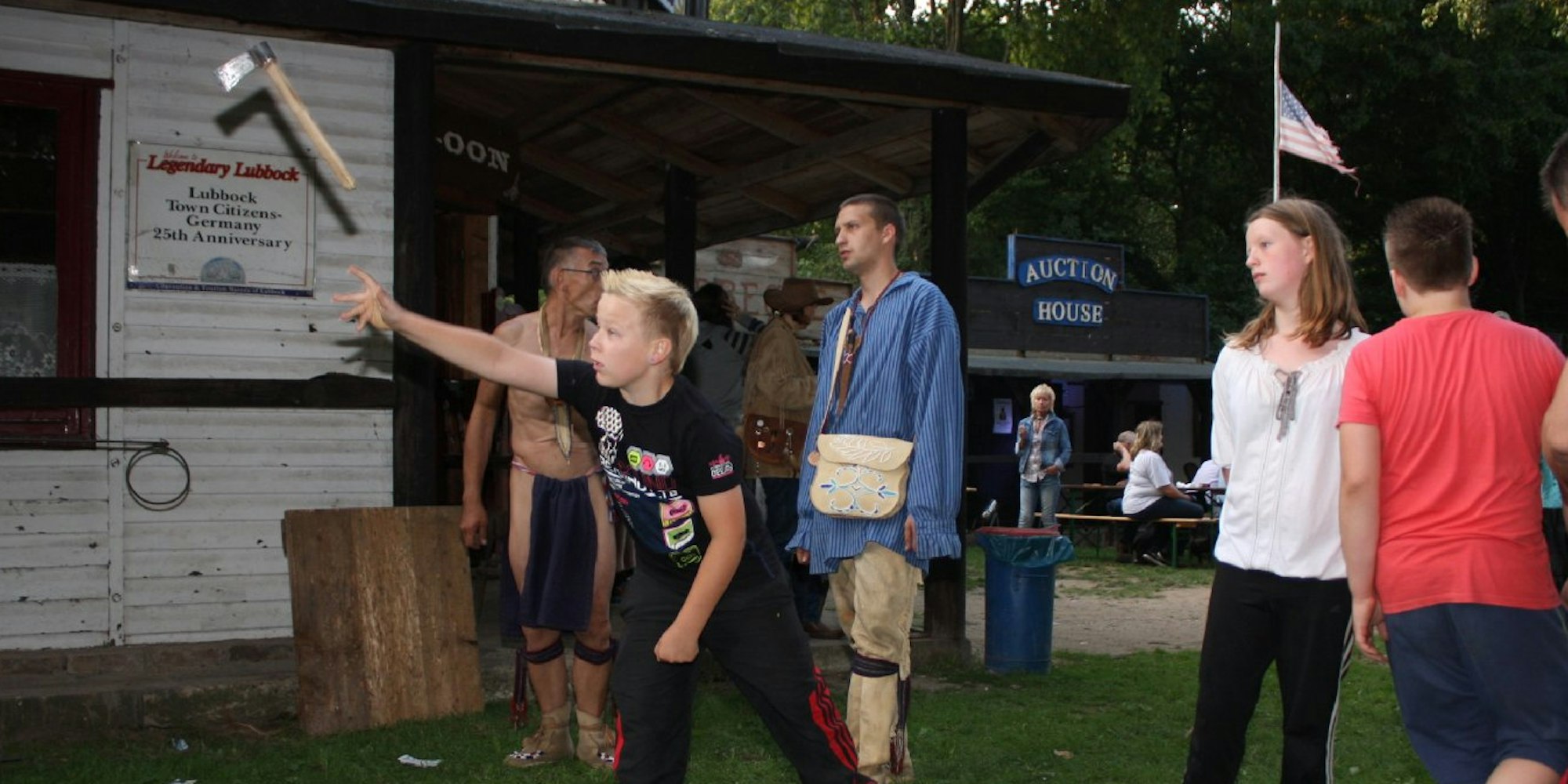 Beim Tag der offenen Tür in der Westernstadt Lubbock Town konnten sich die Besucher im Tomahawkwurf auf eine Zielscheibe versuchen.