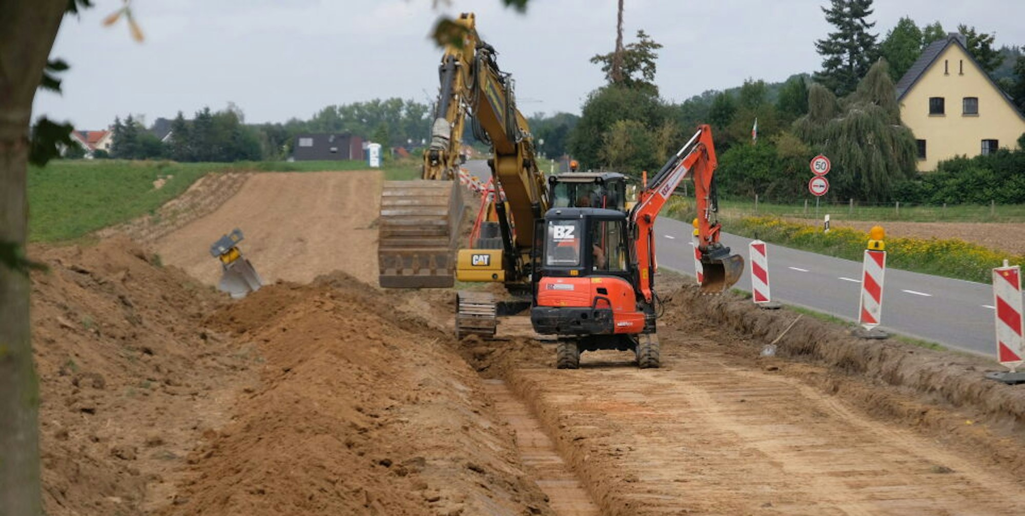 Auf der südlichen Seite der Landstraße 163 haben Bauarbeiter mit Baggern begonnen, den Radweg zu realisieren.