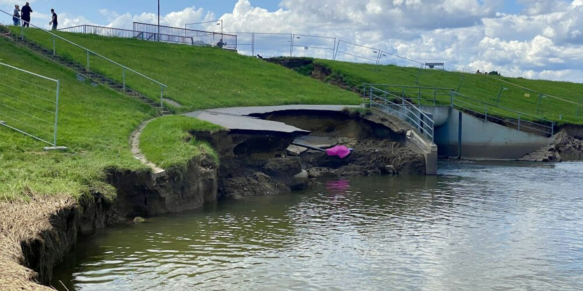 In der Rückschau wird klar: Der Deich am Hochwasserrückhaltebecken Horchheim ist nicht gebrochen, allerdings wurde er von den Wassermassen überflutet und in Folge dessen ist rückseitig ein großes Stück des Bauwerks herausgespült worden.