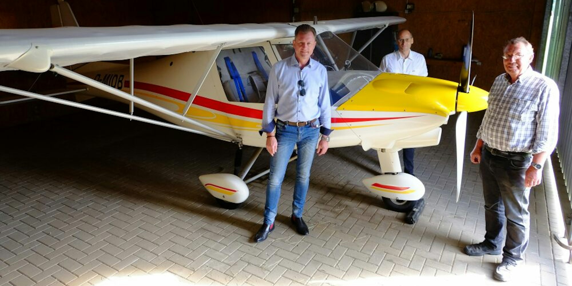 Sind stolz auf die vereinseigene Flugschule und die Vereinsmaschine mit dem amtlichen Kennzeichen D-MIDB, eine Comco Ikarus C42: Stefan Heine, 2. Vorsitzender (v.l.), Armin Denzel, Schriftführer, und der Vorsitzende Dr.-Ing, Werner Roye.