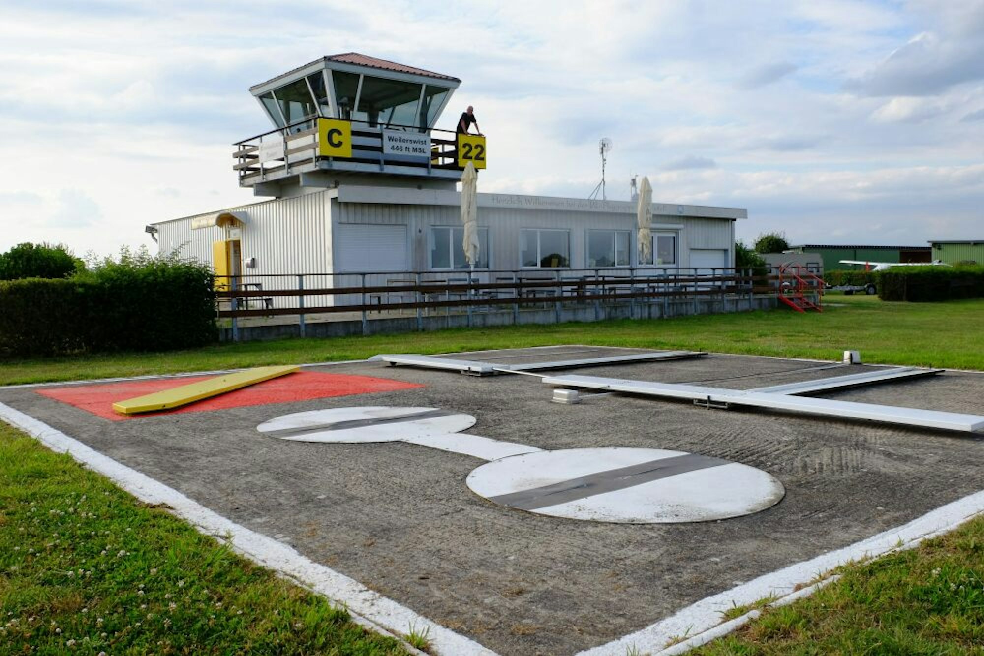 Das Signalfeld vor dem Tower zeigt Piloten, aus welcher Richtung sie starten und landen dürfen und ob der Platz gerade geöffnet ist.