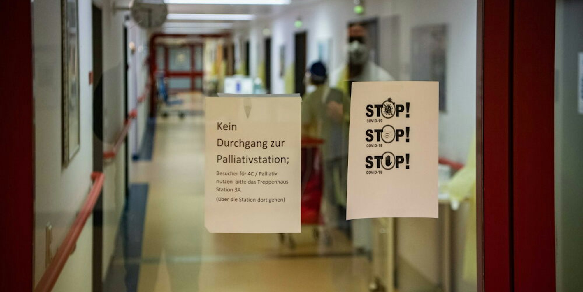 Es ist Mittwochmorgen auf Station 4a des Euskirchener Marien-Hospitals. Hinter diesen Türen werden Covid-19-Patienten behandelt – 40 zurzeit, wie Professor Michael Loick, der ärztliche Direktor des Hospitals und Chefarzt der Intensivmedizin, mitteilt. So viele wie noch nie während der Pandemie.