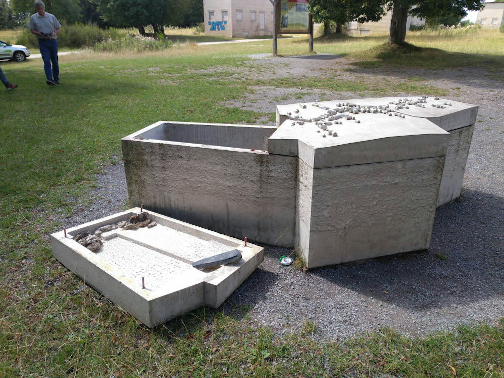 Heruntergewuchtet wurde eine der schweren Abdeckplatten des Dorfmodells.