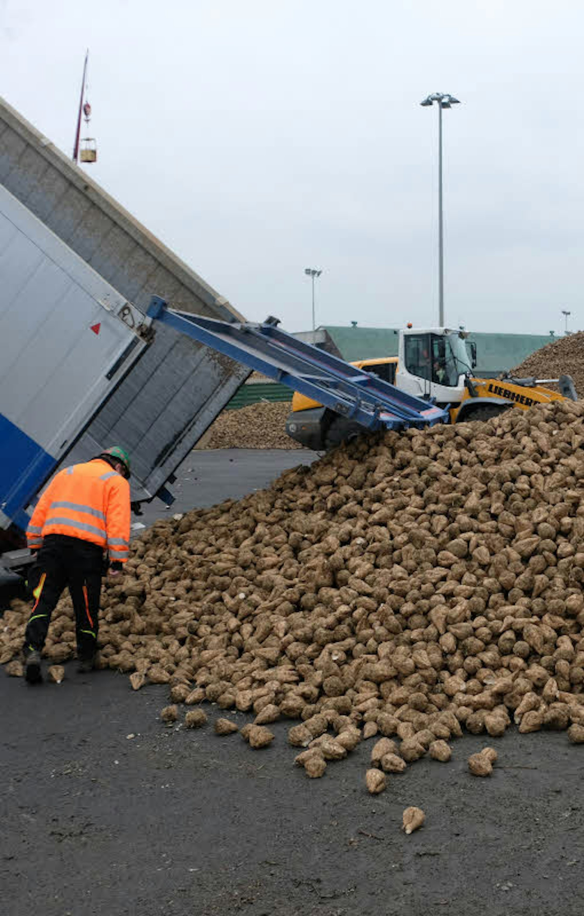 Im Durchschnitt werden Zuckerrüben knapp 25 Kilometer weit nach Euskirchen transportiert, denn nicht nur jeder Kilometer Fracht kostet Geld. Auch Zeit ist Geld, auch für die Transportgruppen, deshalb wird die Verweildauer der Fahrzeuge in der Fabrik erfasst. In der Euskirchener Zuckerfabrik haben die Fahrer unter 13 Minuten Aufenthalt. „Das geht recht schnell von der Waage bis zum Abkippen“, so Leipertz. Dann sind die Traktorgespanne oder die modernen Aluminium-Muldenkipper wieder auf der Straße, um neue Fracht zu holen.