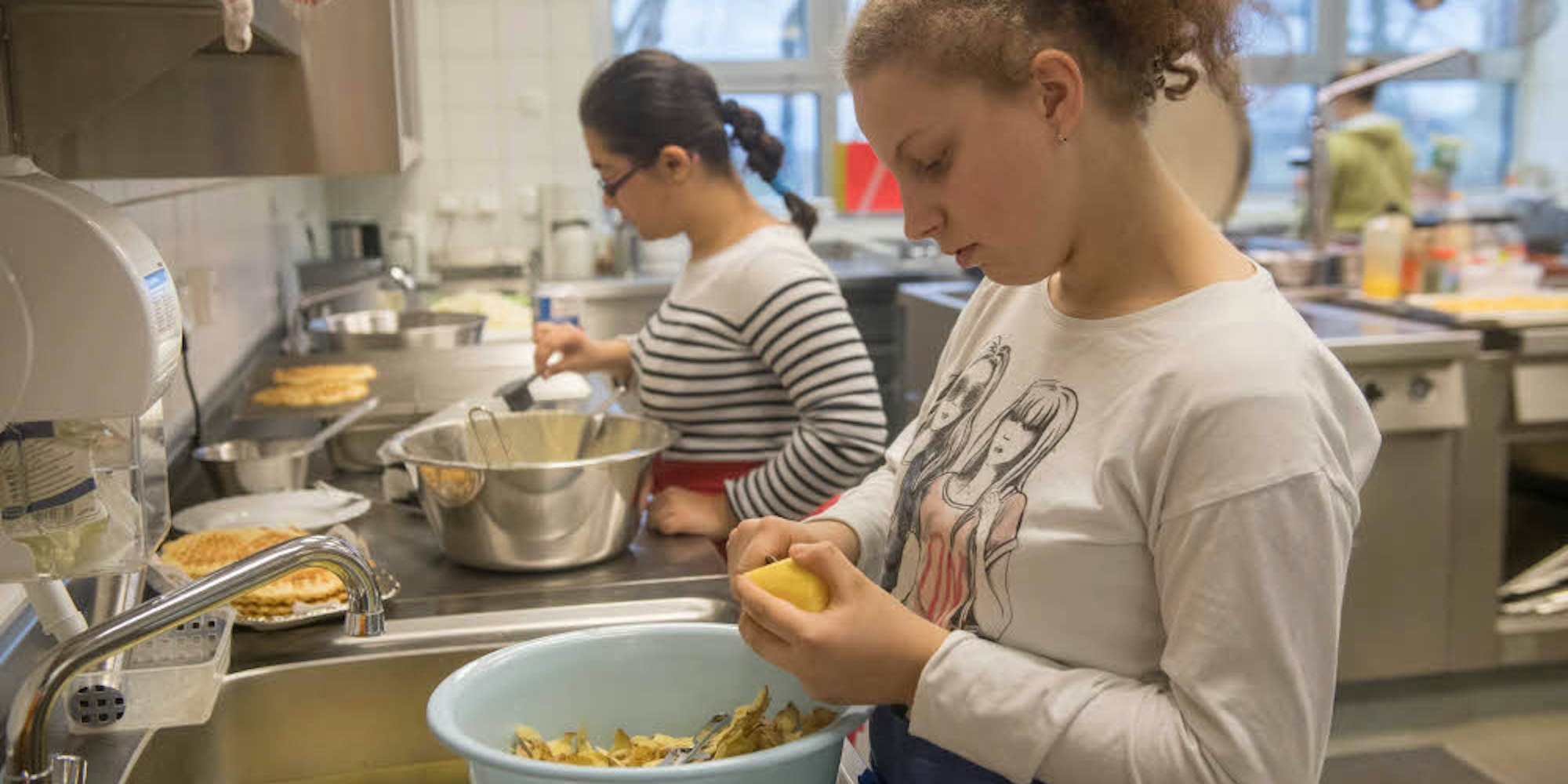 „Ich bin der festen Überzeugung, dass die Schüler das auch ohne die Hilfe von Profis hinbekommen würden. Sie machen ihre Sache wirklich sehr gut“, lobt Belz. Es wird geschnippelt, geschält und gebraten.