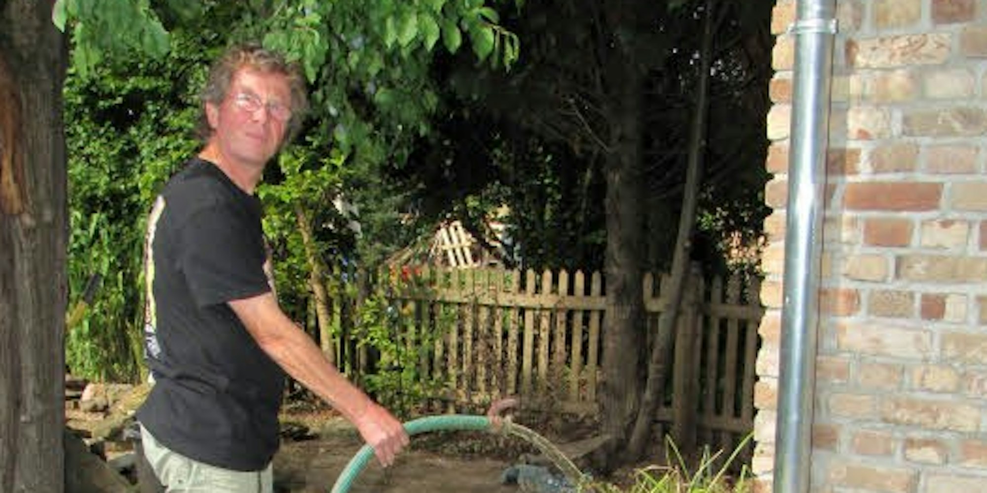 Karl Heinz Jost bewässert mit dem Regenwasser den Garten.