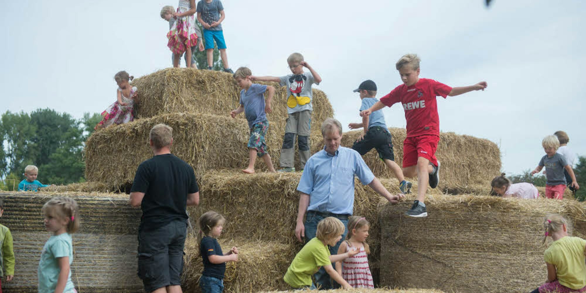 Kinder und Erwachsene konnten ihr eigenes Brot backen oder ihren eigenen Käse herstellen und bei den Kühen im Stall vorbeischauen. Die Tore standen überall offen – so auch in der Bäckerei. Sogar Führungen zur „Grünen Seite vom Hof“ wurden angeboten. „Was wir machen, ist schon ein bisschen erklärungsbedürftig, weil es etwas Anderes ist“, so von Hagenow. Er gehe bewusst ungewöhnliche Wege, gibt der Landwirt zu. Das sei jedoch nur mit den Verbrauchern möglich. „Wenn wir als Landwirte was ändern wollen, können wir das nur zusammen mit den Verbrauchern schaffen“, so der Oberelvenicher Ortsvorsteher. Die große Strohburg war auch diesmal wieder der große Anziehungspunkt für die kleinen Besucher. Hier wurde ausgelassen getobt und geklettert.