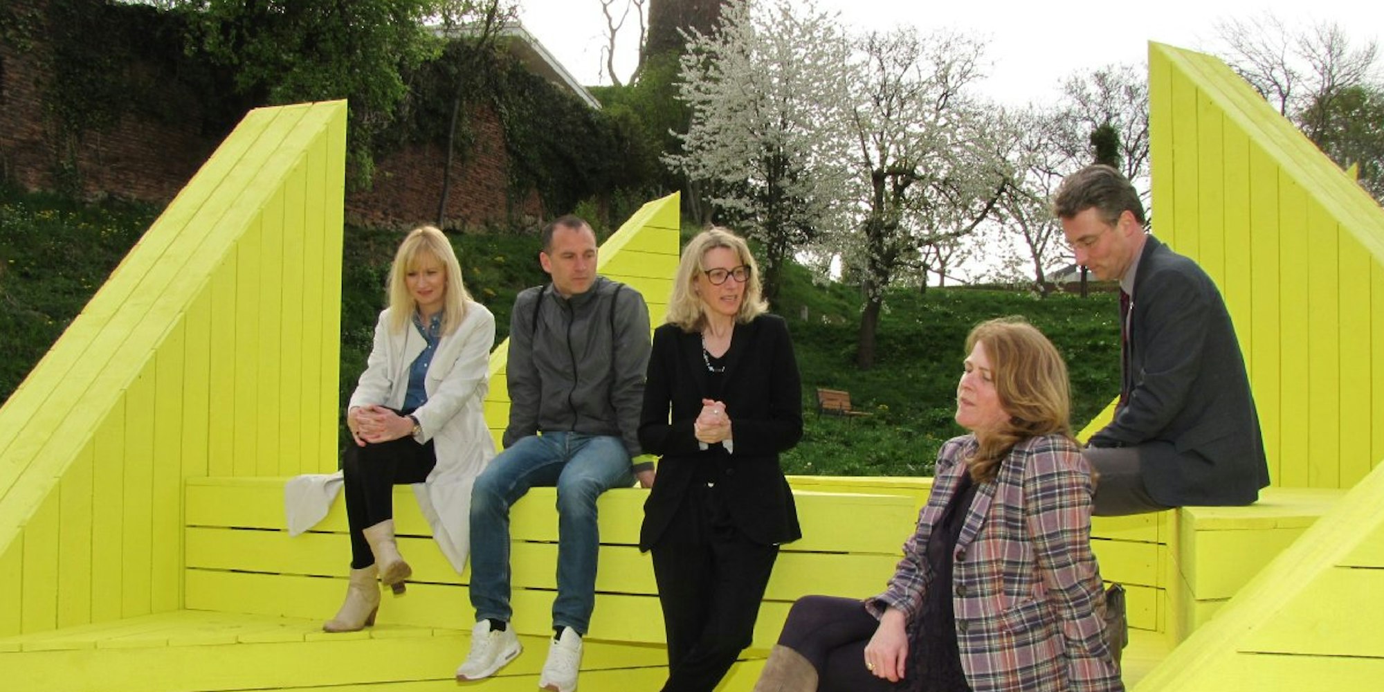 Alle vier Kunstschaffenden haben ihre Ideen bereits in Zülpich umgesetzt. Dankes Beitrag ist eine himmelblaue Installation in der Nähe des Weiertors, unter deren Dach vor allem Schulklassen florale Teppiche weben oder Fantasiewelten aus Ton herstellen können. Pfeifle hat eine gelb-grüne begehbare Plattform mit dem Titel „zetta“ beigesteuert, die unterhalb der Burg zu finden ist. Dort können Künstlertalks, Konzerte und andere Präsentationen über die Bühne gehen. Die Spaziergänger dürfen sich darauf aber auch schlicht und ergreifend ausruhen, wie Pfeifle betonte.