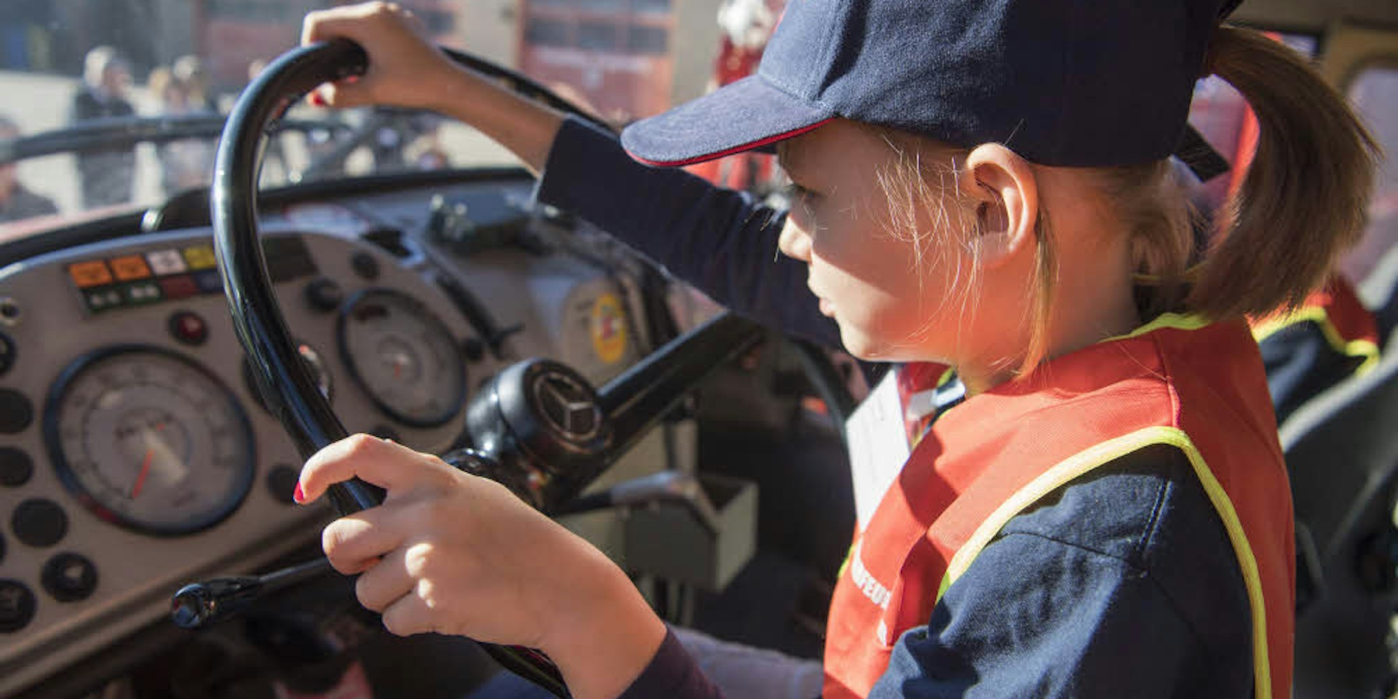 Endlich kann auch der Nachwuchs einmal testen, wie sich das Steuer des Feuerwehr-Autos anfühlt.