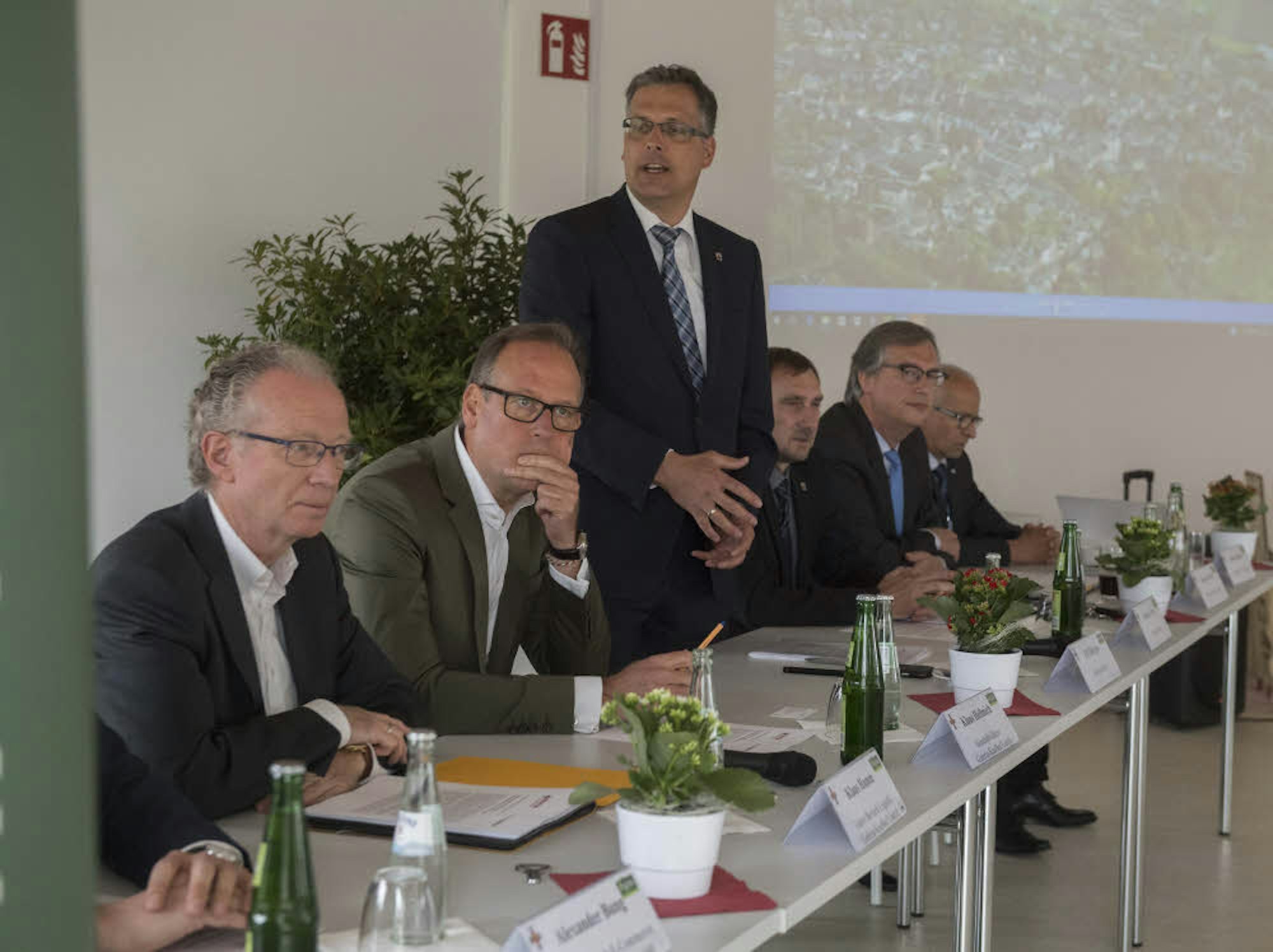 Zülpichs Bürgermeister Ulf Hürtgen (3.v.l.) bei der Pressekonferenz.
