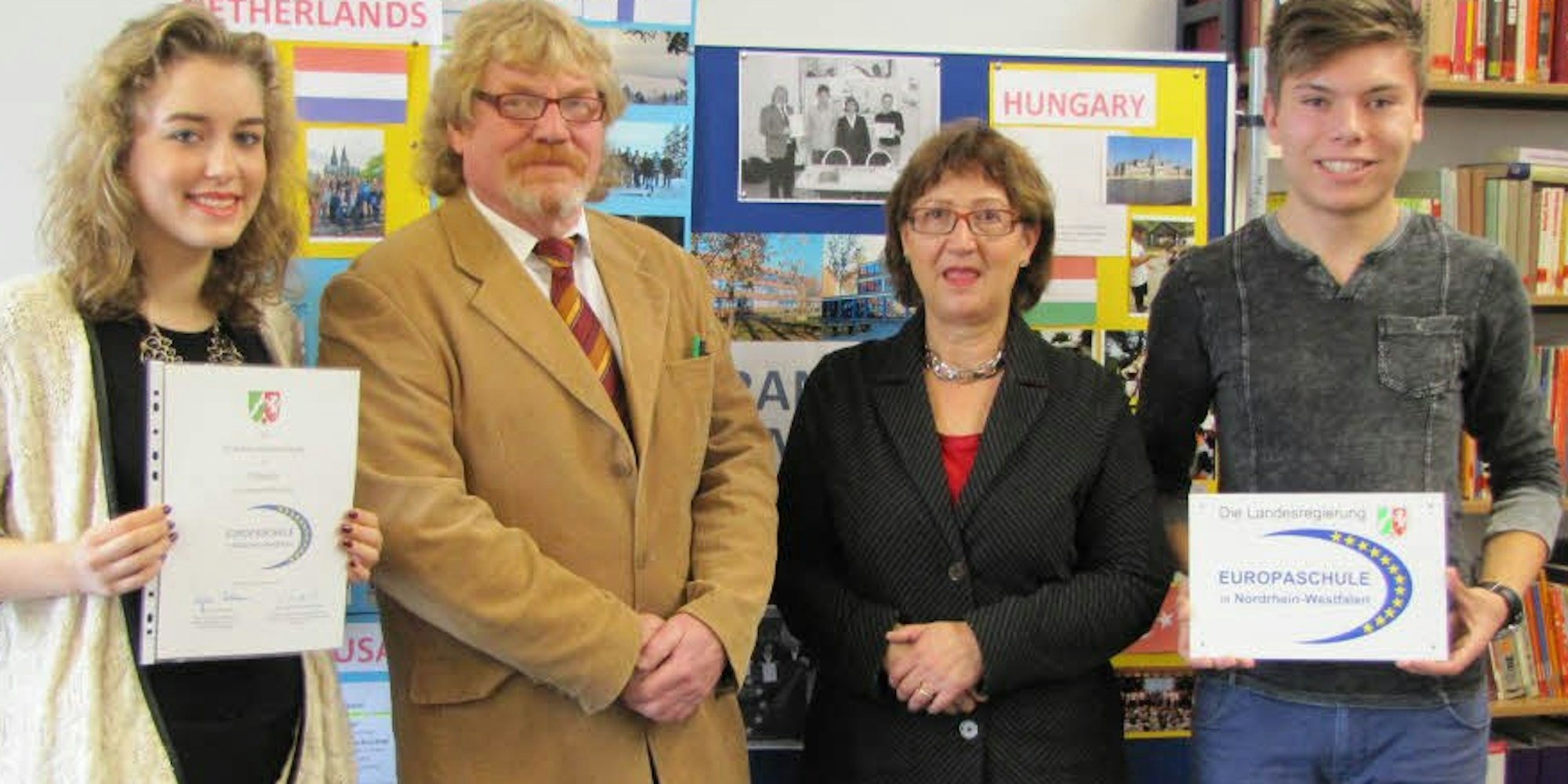 Für die Schüler Hanne Cremer (17) aus Dürscheven und Roberto Schneider (18) aus Erftstadt, sind das ganz entscheidende Vorteile. Die beiden wollen „International Business“ studieren, das ausschließlich in englischer Sprache doziert wird. Als Mitarbeiter an einer 100-seitigen Dokumentation über den Europagedanken am Franken-Gymnasium durften Hanne und Roberto mit Wirtz und Thumann-Langva nach Düsseldorf zur Zertifizierung reisen.