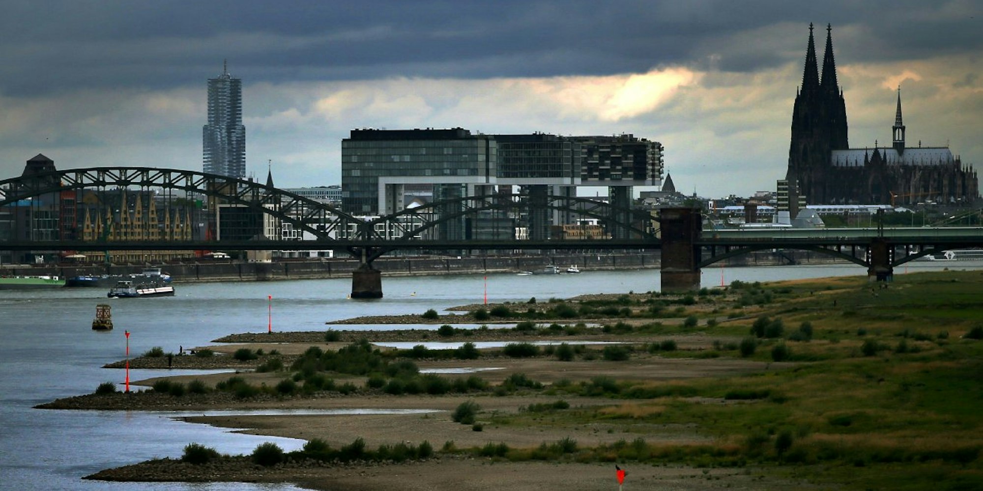 Die Wassermenge, die der Rhein durch Nordrhein-Westfalen transportiert, schwankt gewaltig. Am Kölner Pegel flossen beim Niedrigwasser 2003 gerade einmal 630 Kubikmeter in der Sekunde vorbei. Beim Jahrhundertwasser 1995 waren es 11 000 Kubikmeter.