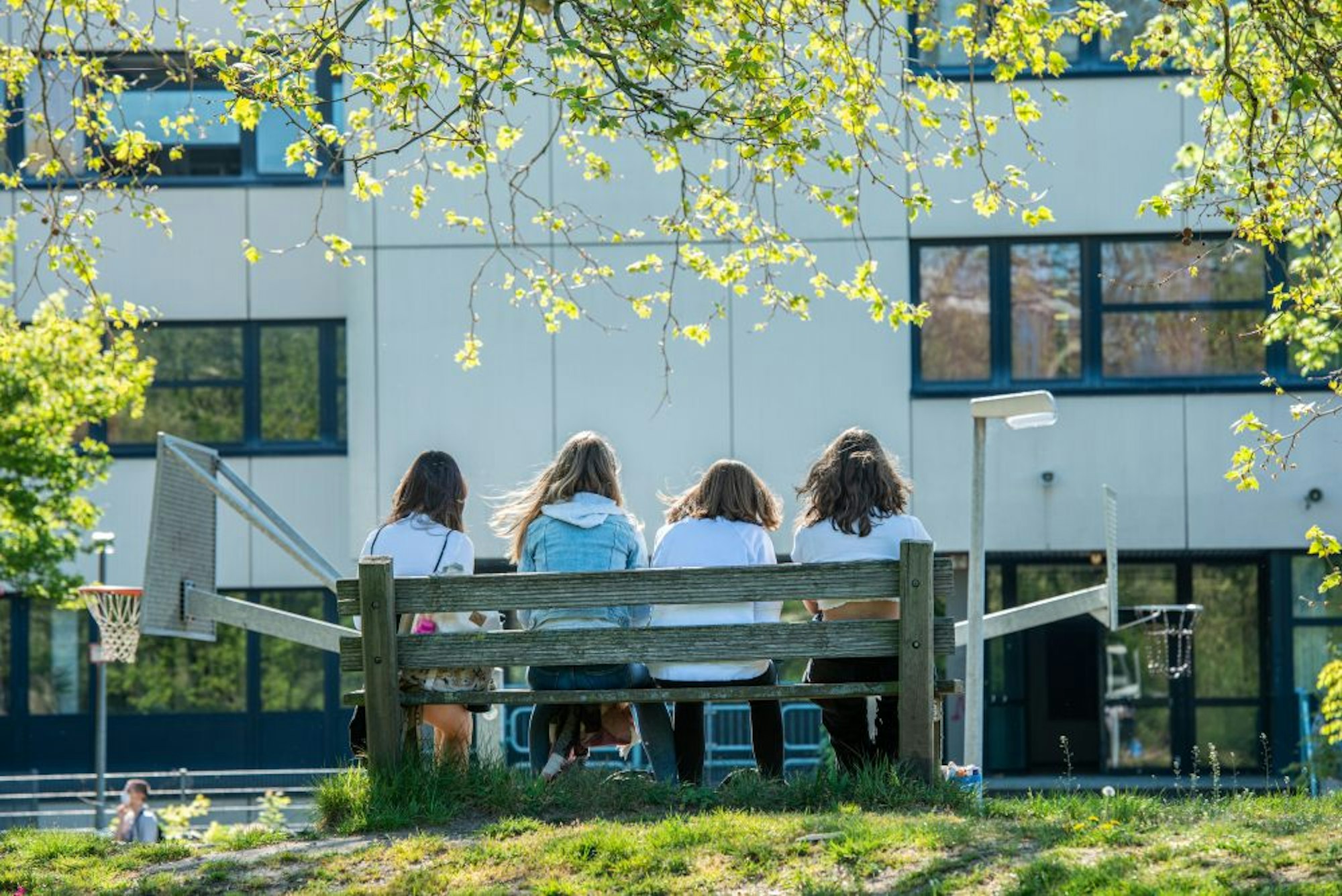 Vier Schülerinnen, denen es schwer fällt, Mindestabstand zu halten.