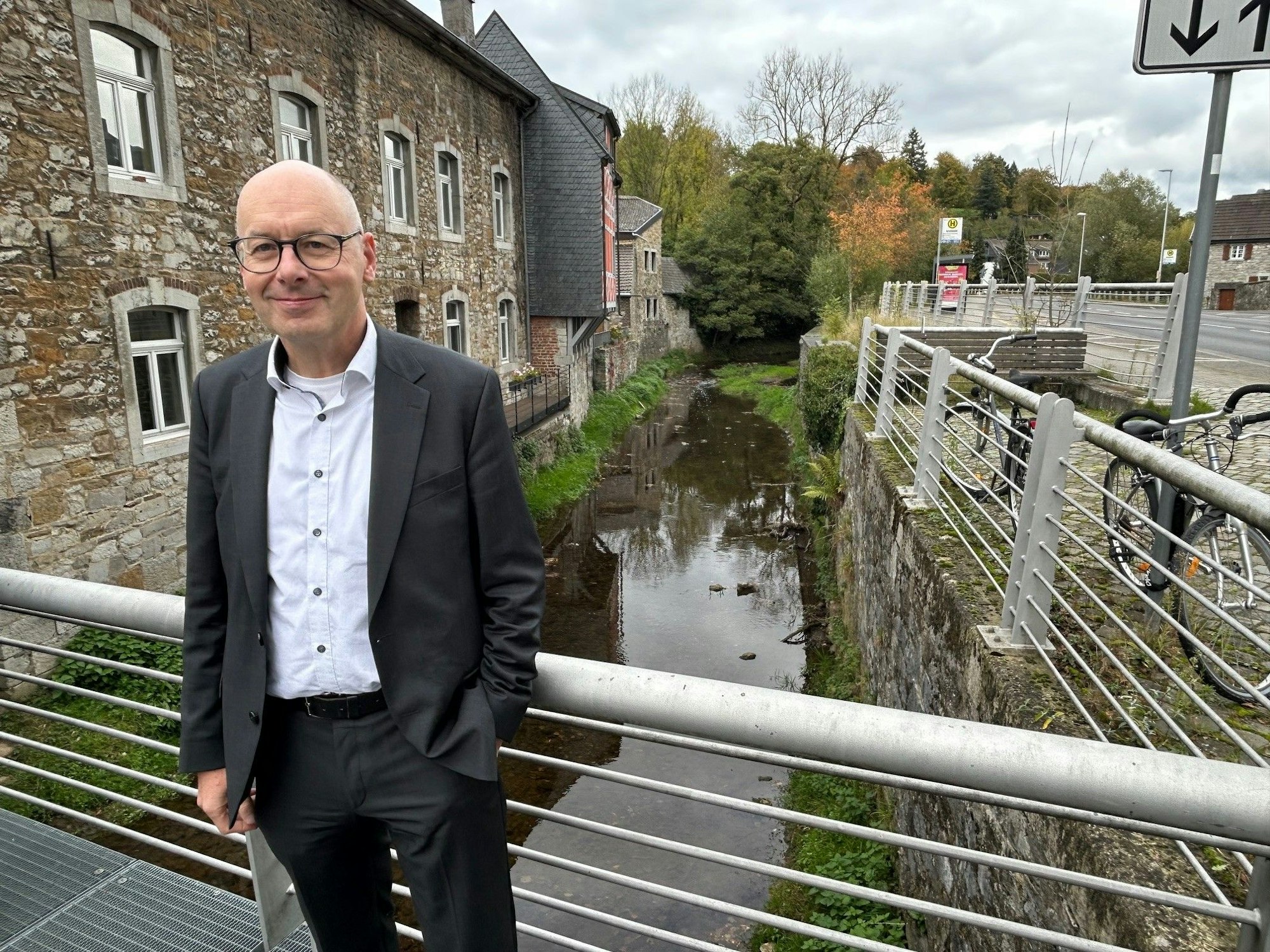 Holger Schüttrumpf, Leiter des Instituts für Wasserbau und Wasserwirtschaft an der RWTH Aachen, steht im Aachener Stadtteil Kornelimünster auf einer Fußgängerbrücke, die über die Inde führt. Unter der Brücke ist das neue Sensor-System installiert.