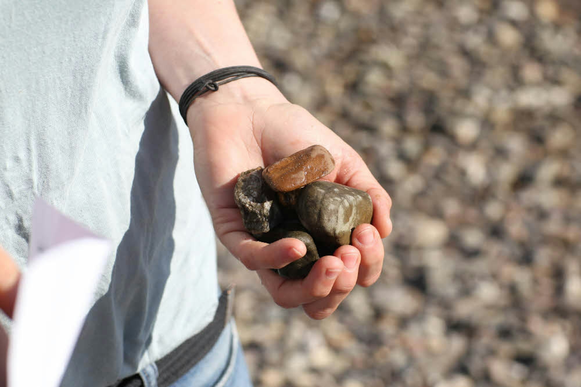 Um zu verstehen, was die Steine erzählen – „wir Geologen sagen übrigens: Gesteine“, sagte Anne Zacke, „wir brauchen schließlich eine eigene Sprache!“ – ist Fachkenntnis hilfreich. „Auf den ersten Blick“, sagt sie, „sieht das Geröll hier am Ufer schwarz-weiß aus.“ Das Dunkle, dies als Faustregel, sind meist die Basalte, die aus Lava entstanden sind; das Helle könnten Kalksteine sein.