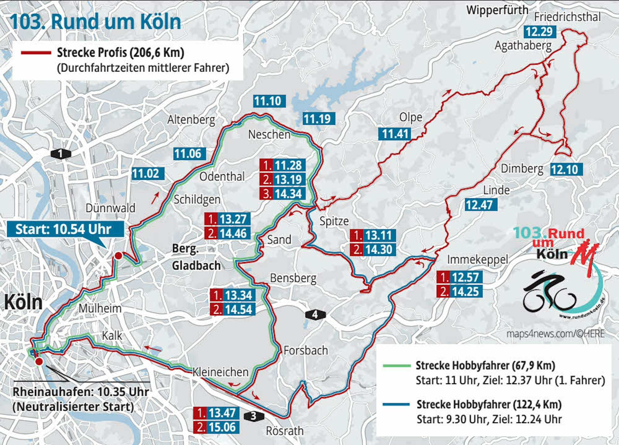 Das Rennen fand nicht nur in Köln, sondern auch in der Umgebung statt. Das älteste noch existierende Eintagesrennen in Deutschland mit der Schleife durch das Bergische Land hat in den vergangenen Jahren allerdings an Attraktivität bei den Rennställen verloren. Von den WorldTour-Teams waren in diesem Jahr in Köln, wo einst Jan Ullrich und Erik Zabel triumphierten, nur noch Katusha und Bora-hansgrohe vertreten. Pfingsten fährt für Bora-hansgrohe, Politt ist bei Katusha unter Vertrag.