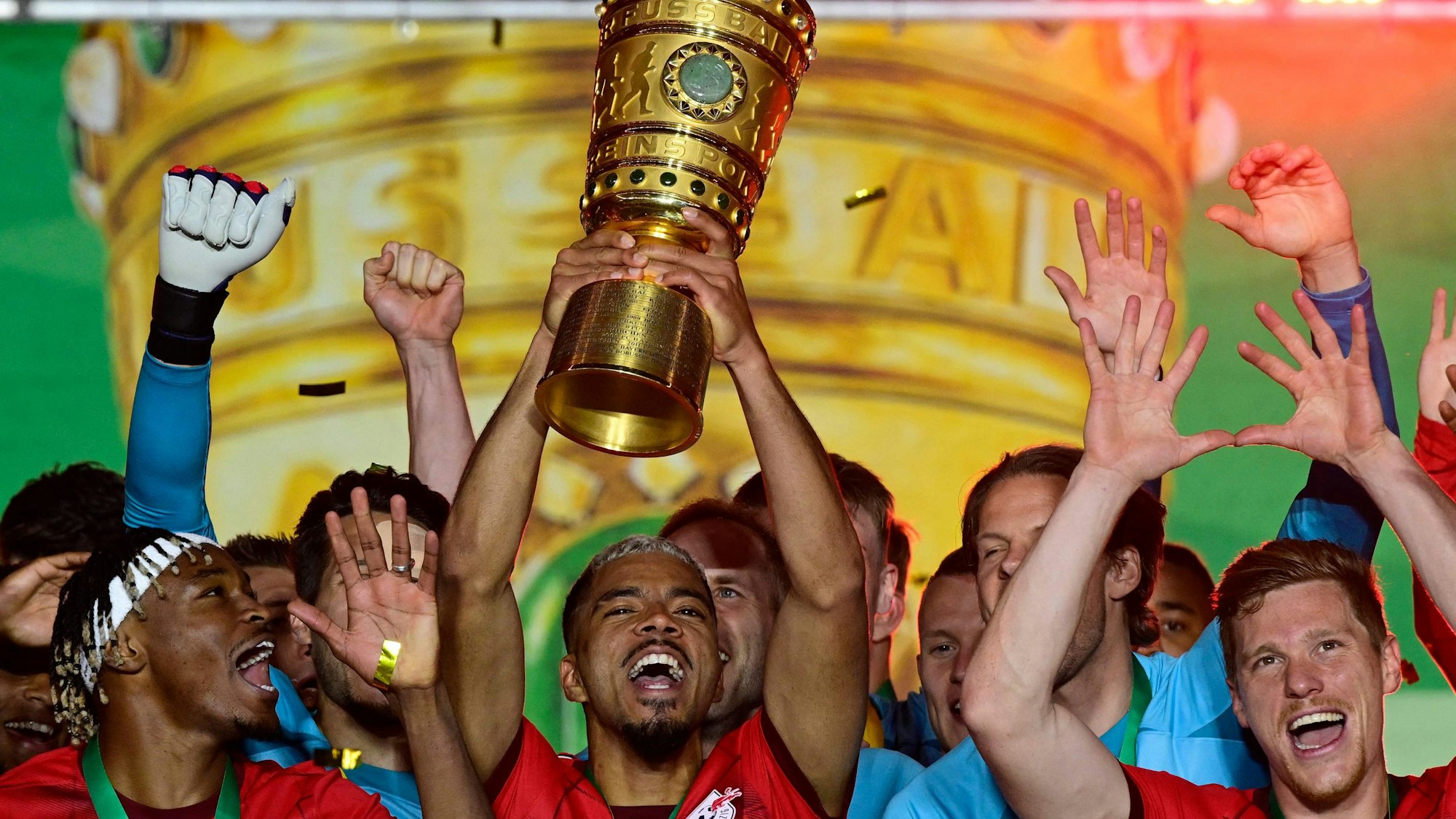 Der Ex-Leverkusener Benjamin Henrichs reckt den Pokal für Leipzig in die Höhe, sein früherer Klub freut sich darüber.