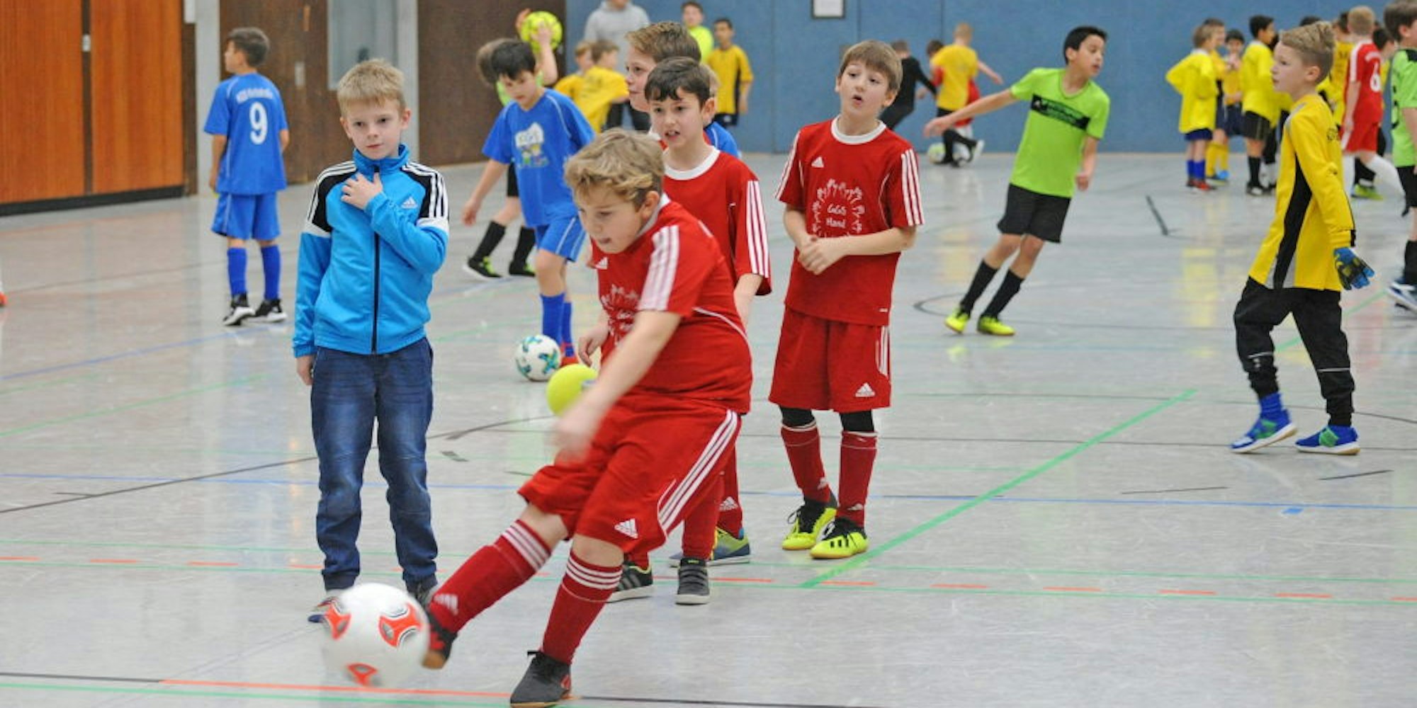 Die Kicker der Grundschule Hand (rote Trikots) unterlagen den Siegern aus Leichlingen im Finale erst beim Sieben-Meter-Schießen.