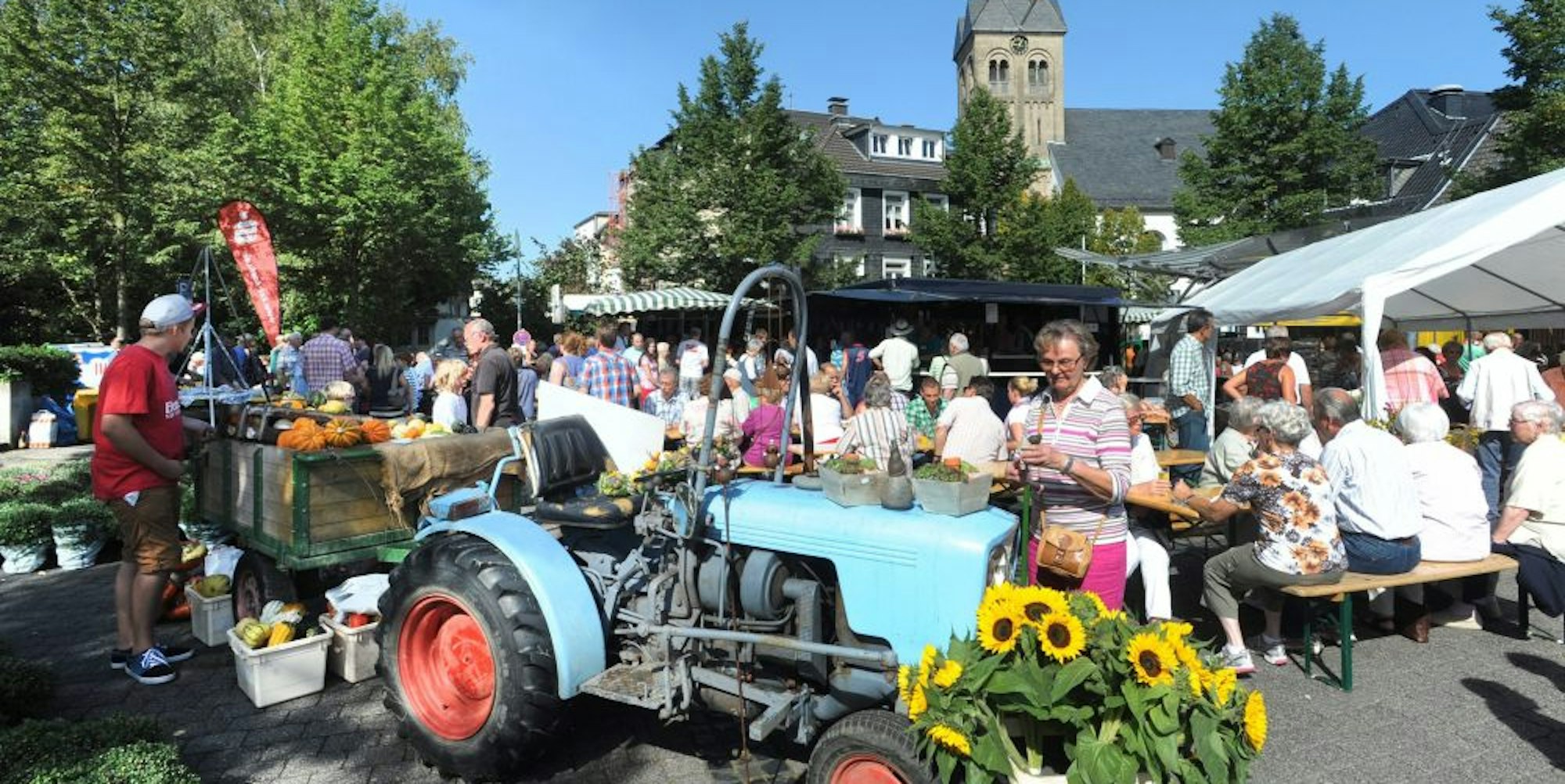 Am Sonntag feiert die Bücherei und wird auf dem Burscheider Marktplatz der Bauernmarkt aufgebaut. Dort bieten die örtlichen Landwirte und Obstbauern Milch- und Fleischprodukte, frisches Obst und Gemüse, Gartenpflanzen, Gestecke, Imker-Honig und Kuchen aus den Backöfen der Burscheider Landfrauen an.