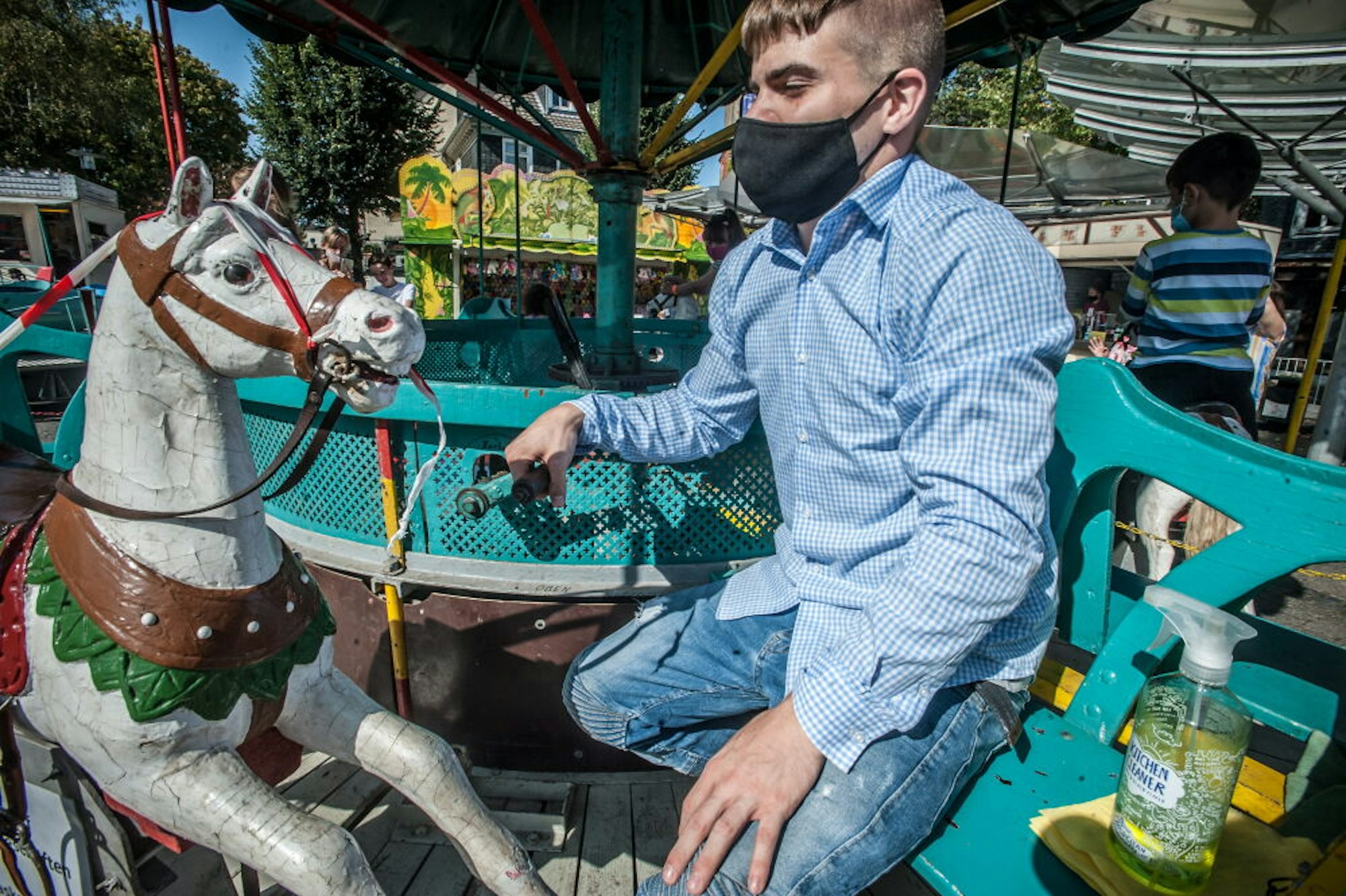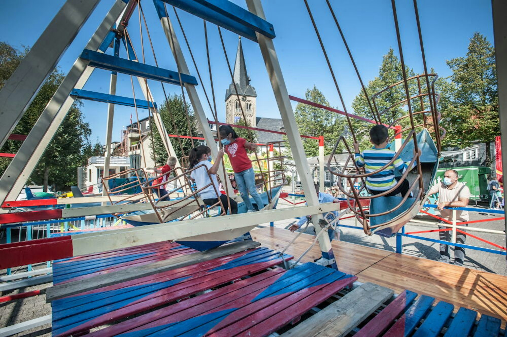 Trotz begrenzten Platzes habe man sein Bestes gegeben, um den Burscheidern möglichst viel bieten zu können. Dabei wurde jedes der drei Fahrgeschäfte mit viel Liebe ausgesucht: Das türkise, noch mit Handkurbel betriebene Kinderkarussell aus den 1930er Jahren war besonders unter den noch sehr kleinen Gästem beliebt. Neben den vier Pferden konnten die Eltern auf Bänken mitfahren.