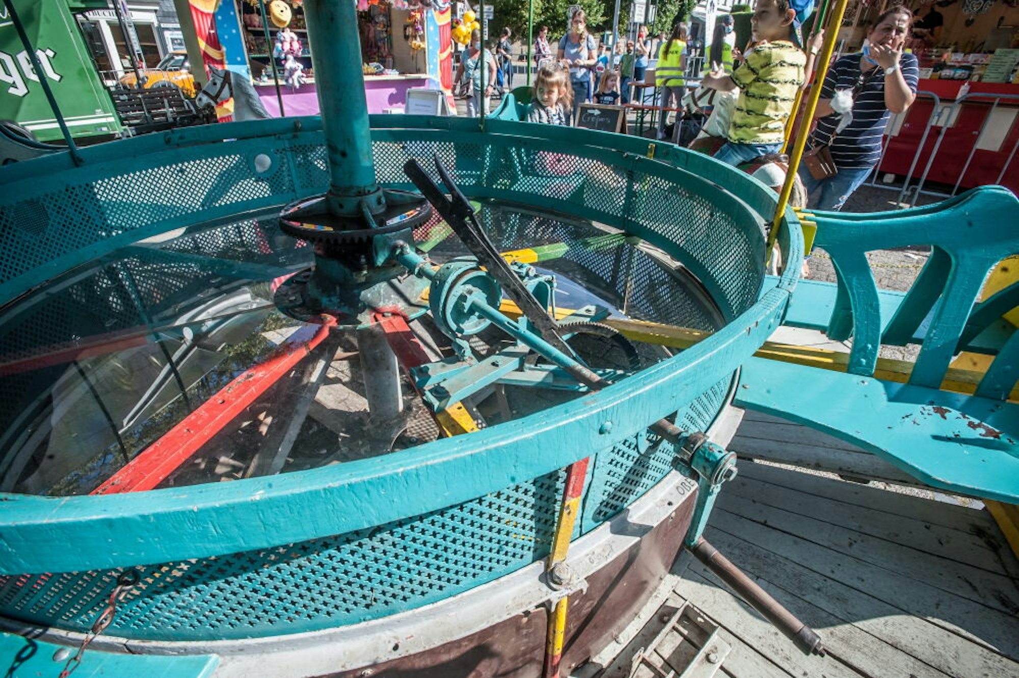 Das türkise Kinderkarussell aus den 1930er Jahren wird noch mit Handkurbel betrieben.