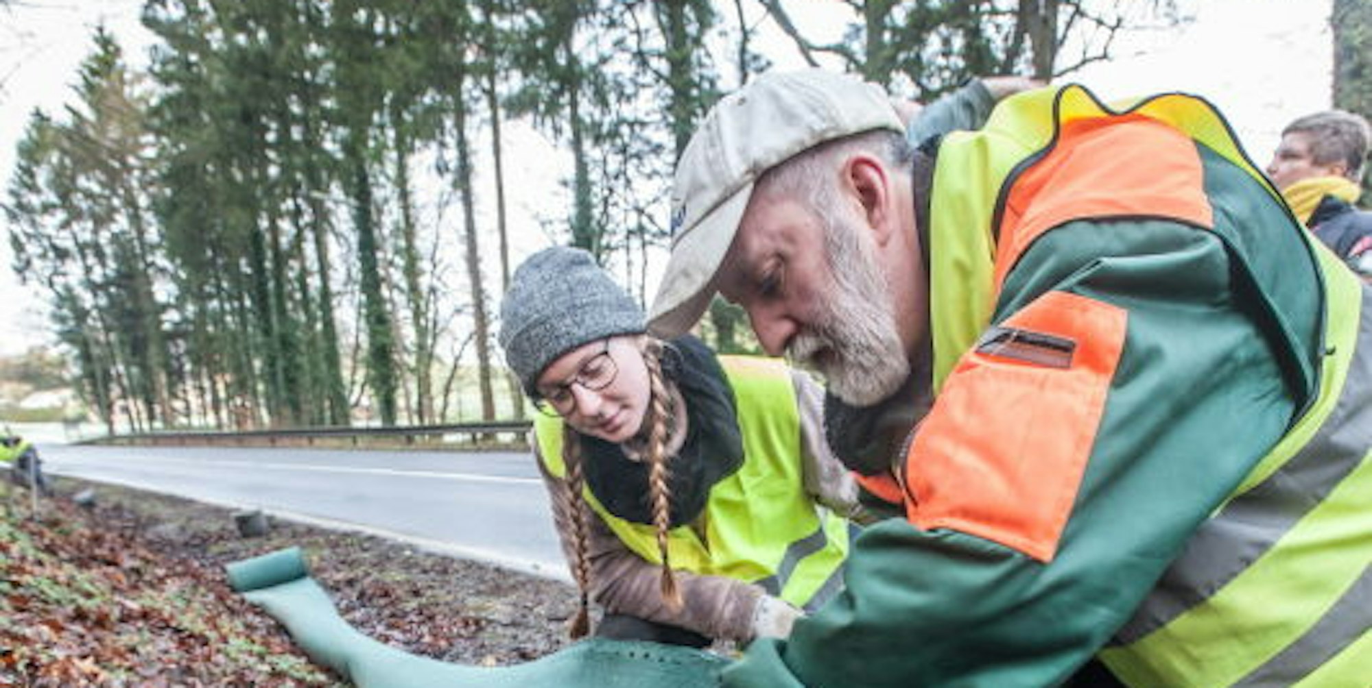 Nabu-Vorstand Thomas Wirtz und Lea Zander, die ihren Bundesfreiwilligendienst macht, bauten an der K 2 wieder den Amphibienschutzzaun auf.