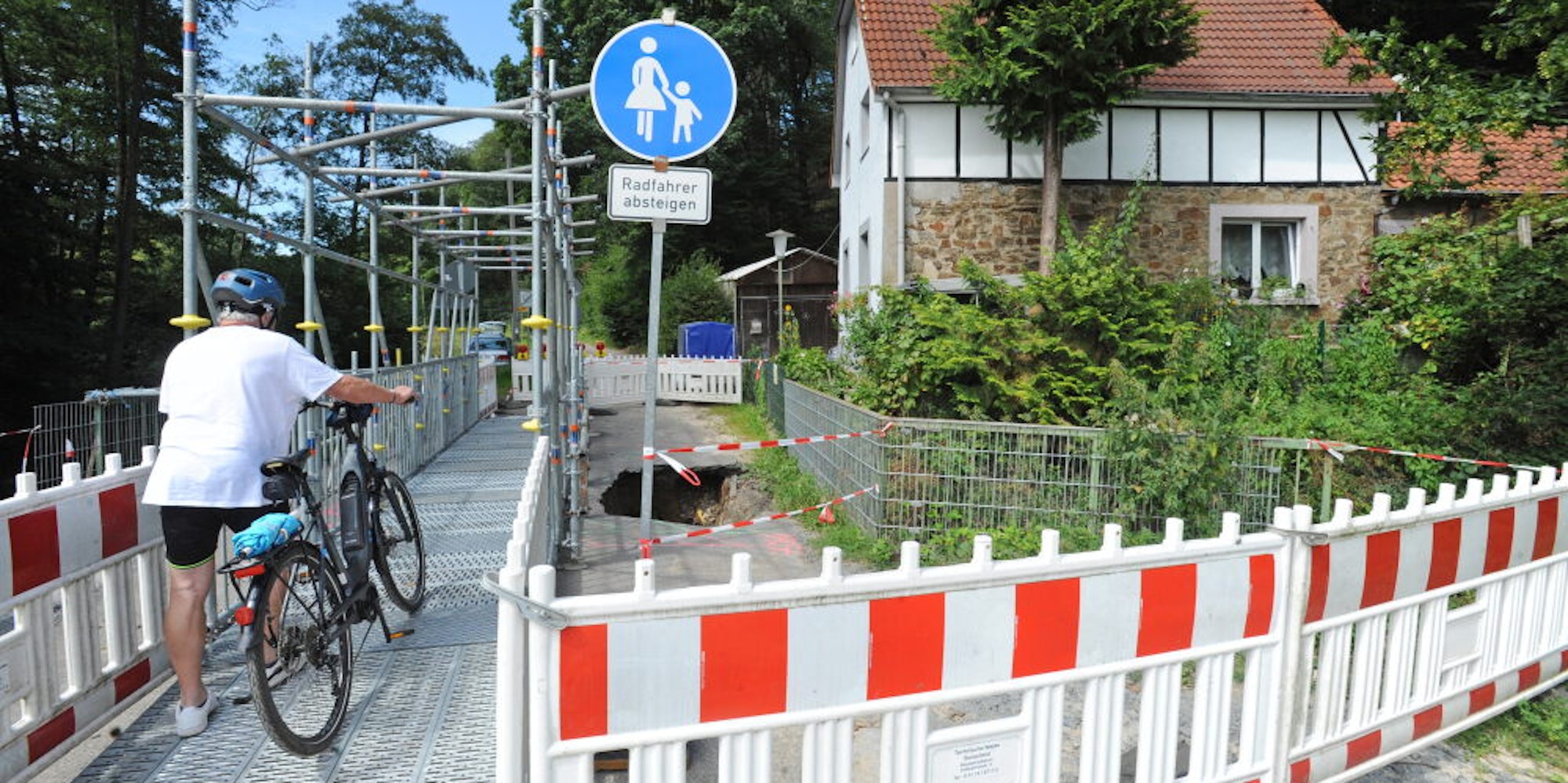 Wegen der Sperrung der Brücke über den Wiembach in Dürscheid, die beim Starkregen am 15./16. Juli zerstört worden ist, ist die Zufahrt zur Straße Im Hintertal dann nur über die Lambertsmühle möglich. Seit Donnerstag gibt es allerdings wieder eine Fußwegverbindung über die Brücke im Verlauf der Dürscheider Straße, am Ortsausgang Richtung Leverkusen. Der provisorische Gerüst-Steg sichert auch wieder die Verbindung Richtung L58 und den dort für Schulkinder wichtigen Haltestellen. Radfahrer müssen absteigen, Autofahrer die Umleitung über Lambertsmühle/Repinghofener Straße nutzen.