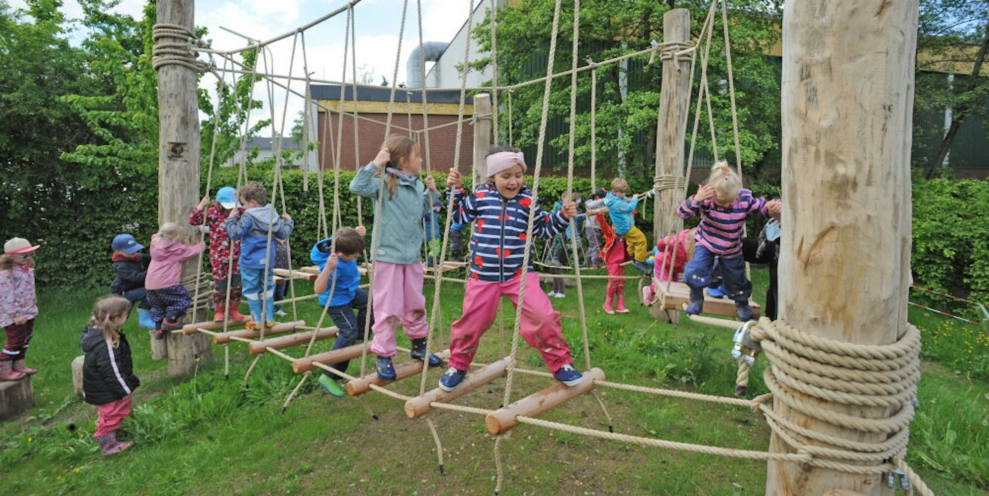 „Das war schon lange ein Traum von mir“, erklärte Ulrike Kreffter, während sie stolz ihre Schützlinge beim Erkunden beobachtete. Seit 1992 leitet sie die Kita. Ihre Wünsche an den Kletterparcours hatte sie an das Bergisch Gladbacher Unternehmen Nuas weitergegeben, die Natur und Abenteuer Schule setzte das Projekt dann um.