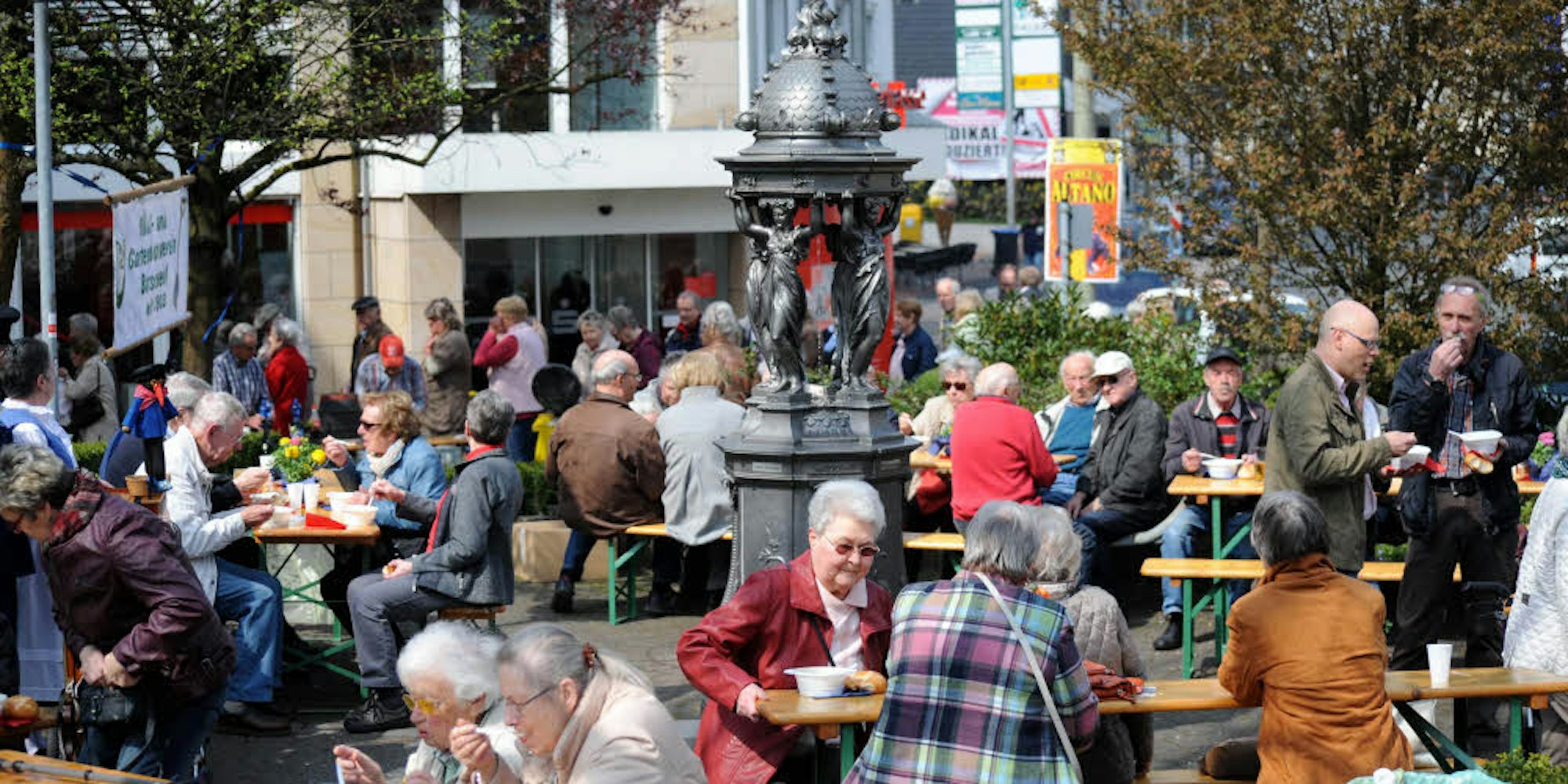 Burscheid – „Wasser marsch“ hieß es am Donnerstag wieder beim obligatorischen Brunnenfest, zu dem der Obst- und Gartenbauverein Burscheid auf den Platz neben der Sparkassenfiliale einlud. Zu seinem hundertjährigen Bestehen hatte der Verein den historischen Brunnen restauriert und dort 2003 aufgestellt. Da das Wasser über den Winter abgestellt werden muss, läuten die Vereinsmitglieder den Frühling ein, wenn es wieder aufgedreht wird und verbinden das mit einem Fest.