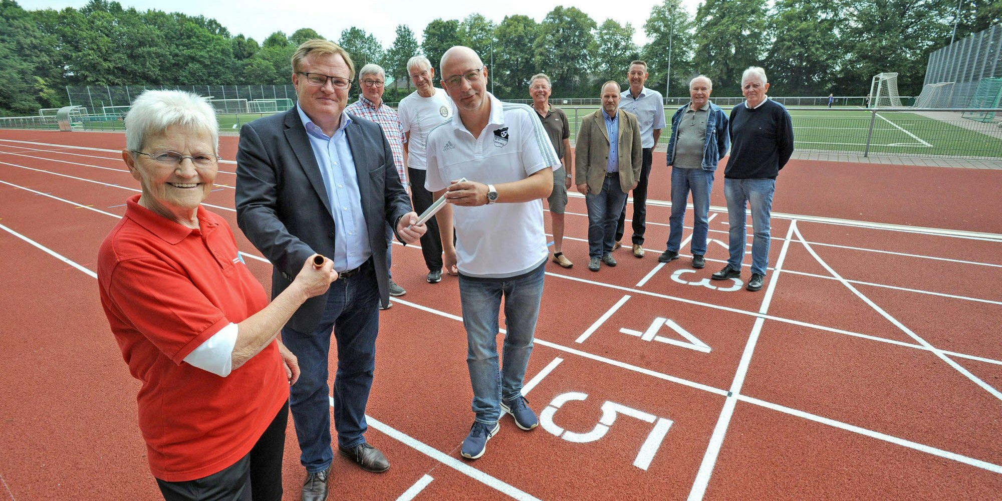 Burscheid – Überall in Deutschland sind in diesen Wochen die Bundesjugendspiele. In Burscheid nicht. Aber die Stadt hat jetzt gleich zwei Sportplätze, die sich für athletische Disziplinen geradezu anbieten. Und das war am Donnerstagnachmittag dann auch Thema, als Bürgermeister Stefan Caplan nach der Neugestaltung des Sportplatzes am Griesberg nun die Staffelstäbe an den Ballspielverein Burscheid und dessen Vorsitzenden Bernd Hammans als Hausherrn des Platzes übergab. Mit zahlreichen Aktiven hat er die Neugestaltung des Platzes an der Griesberger Straße vorangetrieben. Die Anlage erhielt eine 400 Meter lange Kunststofflaufbahn nebst- Hochsprung- und Weitsprungeinrichtung, ein kleines Fußball-Tennisfeld und einen Kopfballtrainer. Insgesamt ist die Tartanfläche 6500 Quadratmeter groß.