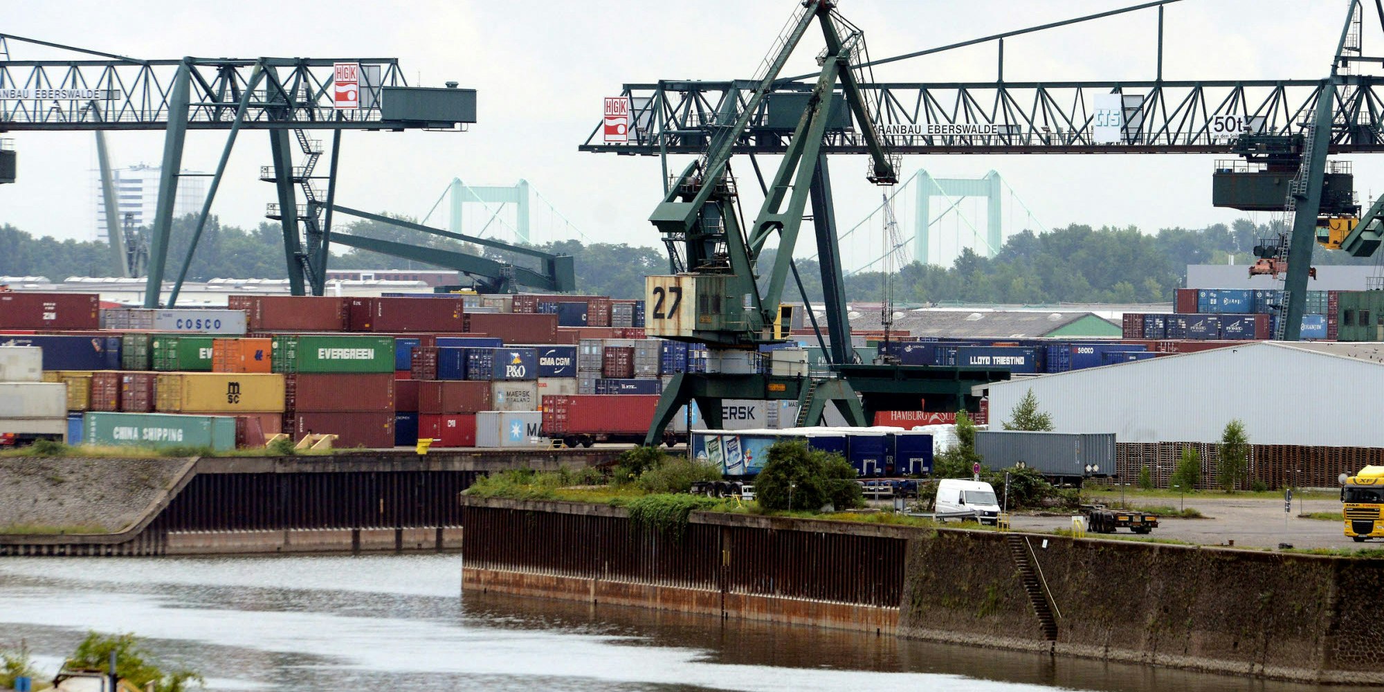 Der Niehler Hafen in Köln ist Umschlagsort für Container aus aller Welt. Im Hintergrund die Mülheimer Brücke.