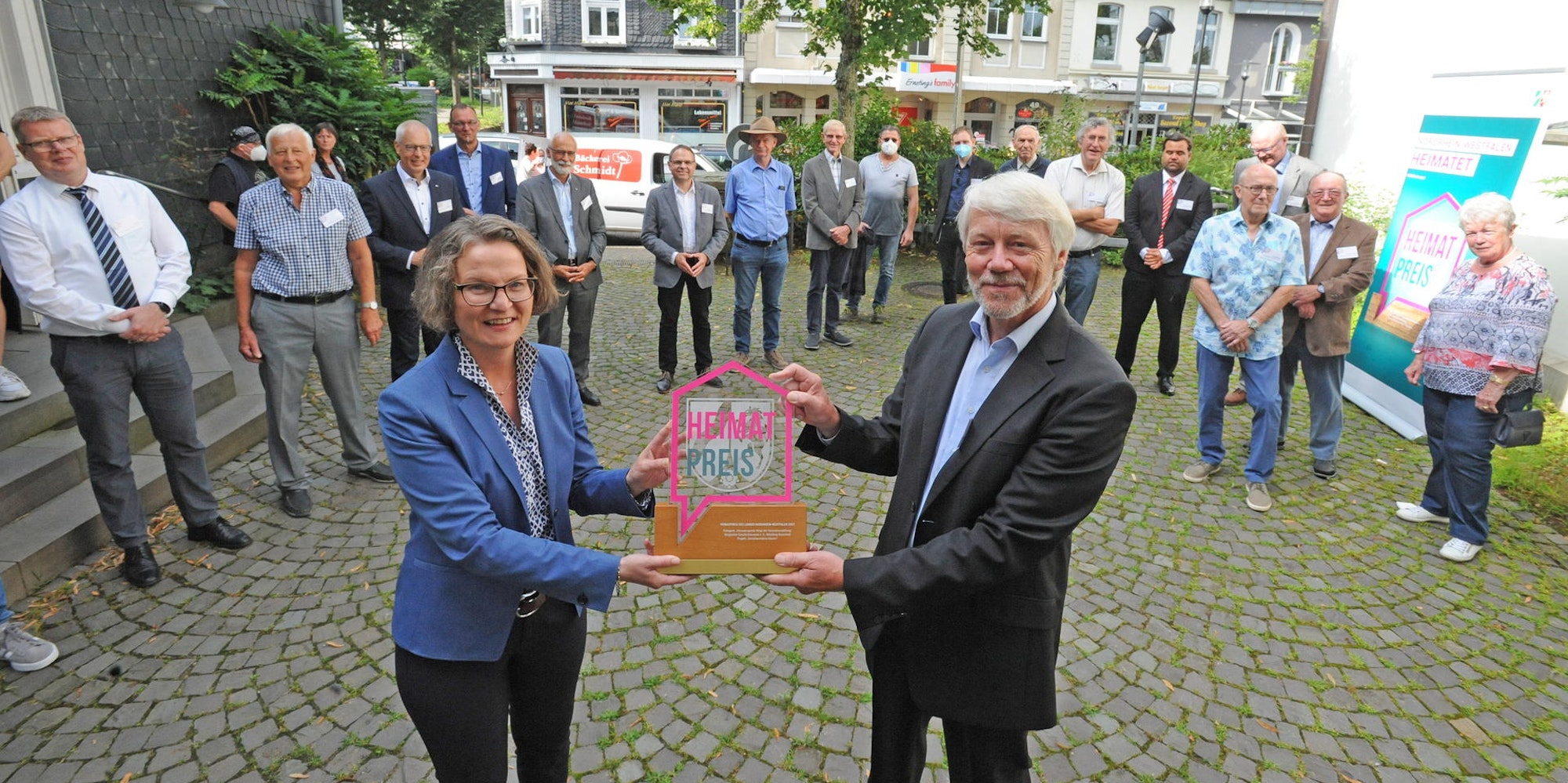 Burscheid – „Ich kann die Gegenwart nur gestalten, wenn die Vergangenheit eines Ortes bekannt ist“, sagte Ministerin Ina Scharrenbach auf dem Vorplatz der evangelischen Kirche am Donnerstag. Die Chefin des Ministeriums für Heimat, Kommunales, Bauen und Gleichstellung des Landes Nordrhein-Westfalen reiste in das bergische Städtchen, um den Heimat-Preis an die Burscheider Abteilung des Bergischen Geschichtsvereins zu überreichen. Nachdem das Projekt „Verschwundene Häuser“ des Vereins bereits auf städtischer Ebene gewonnen hatte, würdigte nun auch die Landesregierung das Engagement der Aktion „für, in und mit Heimat“.