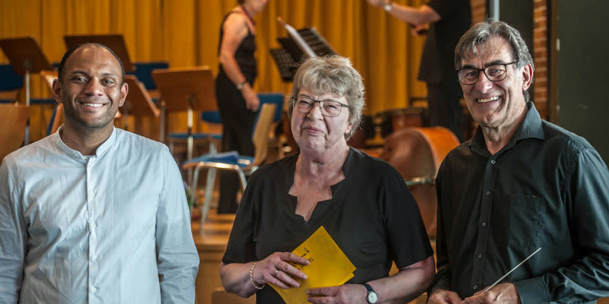 Die Vorsitzende der Academie Anke Wischer mit dem neuen Dirigenten David Boakye-Ansah (links) und Wolfgang Georg.