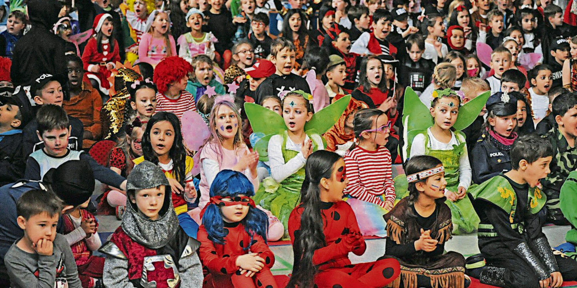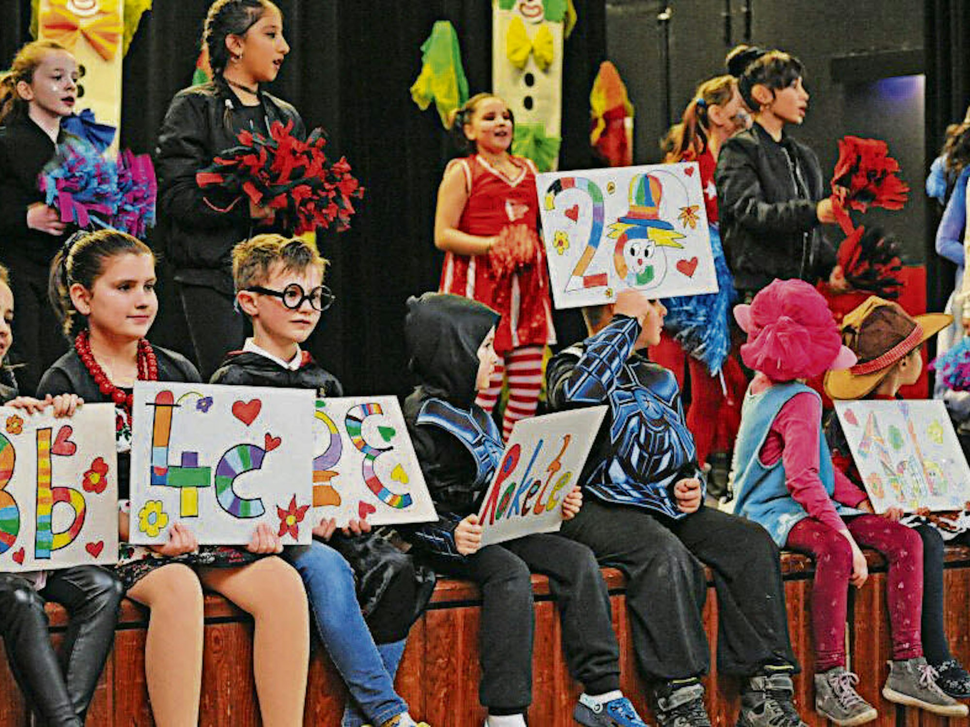 Erdbeeren, Elfen, Piraten, Matrosen, Graf Dracula und ein paar Engelchen – ausgefallene, neue und traditionelle Kostüme waren da auf der Bühne zu sehen. Und beim Tanz legten die Kinder ihr ganzes Temperament an den Tag. Da wurden Räder geschlagen, das gepunktete Kostüm tanzte mit dem gestreiften und angefeuert wurden die Artisten auf der Bühne durch Klassenkameraden, die auf dem Boden oder in den Stuhlreihen saßen. Das Eis brachen Cheerleader und dann kam das Fliegerlied von Tim Toupet mit „So ein schöner Tag“ aus unzähligen Kehlen. Auch Pippi Langstrumpfs Lieder lebten auf und bei „Time Warp“ aus der Rocky Horror Show wurde es richtig turbulent.