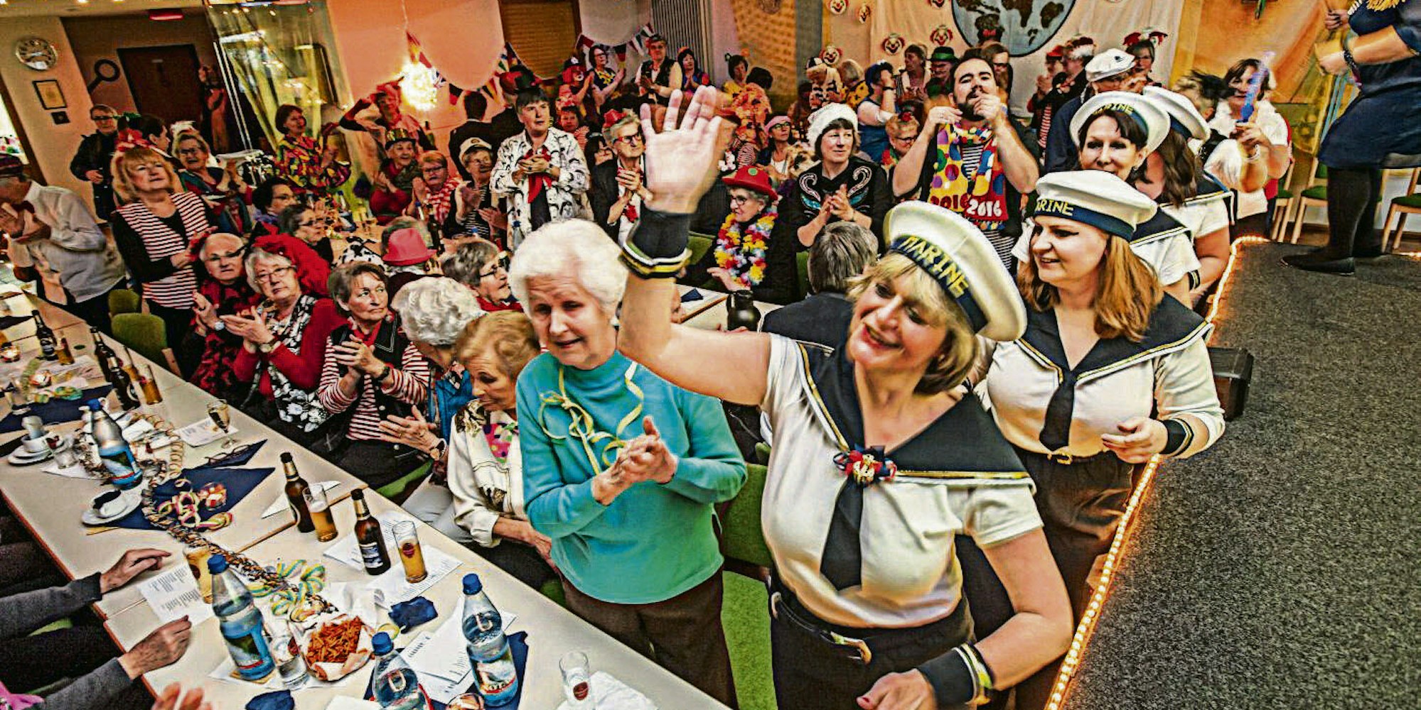 Dabei hatte sie der Verkäuferin doch klar gemacht, dass sie gleich mit Last-Minute-Flug nach Mallorca aufbreche. Da brauche sie doch einen Badeanzug, Kosmetik und am besten auch noch eine gefüllte Geldbörse. Alles war einfach nicht im Preis drin. Das wiederum enttäuschte die Kundin. Gar nicht enttäuschend war hingegen das pfiffige Programm das die Damen der Katholischen Frauengemeinschaft (KfD) im vollen Pfarrsaal auf die Bühne brachten. Alles stand unter einem Maritim-Motto. Der Elferrat aus den KfD-Frauen hatte sich mit Matrosenkostümen in Schale geworfen und als Orden gab es kleine Papierschiffchen. Mit einem tiefen Schiffssignalton wurde das kurzweilige Bühnenprogramm immer wieder angeheizt und kleine Pannen in der Technik meisterten die Närrinnen im Boot souverän. Hanni Dreyer gab Einblick in die Nöte einer Seniorin, die bei Aldi ihr erstes Laptop ersteht und aus der Gebrauchsanweisung in Handbuch nicht ganz schlau wurde. Ein bisschen verlegen wirkten die beiden männlichen Besucher der Damensitzung, das waren Kaplan Christian Figura und Pastoralreferent Benjamin Floer aus Wermelskirchen, bei so manchem schlüpfrigen Witzchen. Aber die Damen, und für die war die Sitzung ja gemacht, hatten ihre helle Freude. Allein wie Hanni Dreyer fünf Minuten lang an dem Laptop nestelte, bis sie ihn aufgeklappt hatte, löste Wogen des Applauses aus. Und mit schmissiger Musik aus allen Ländern wurde das Motto „Lauli macht sich die Welt, wie sie ihr gefällt“ gelebt. Sitzungspräsidentin Martina Dürdoth führte durch den Nachmittag und ihre große Gabe, sich selbst auf die Schippe zu nehmen, begeisterte ungemein. Die Rheinmatrosen in Köln wollten keine Hebefigur mit ihr machen, erklärte sie. Und das lag natürlich „an der niedrigen Decke.“