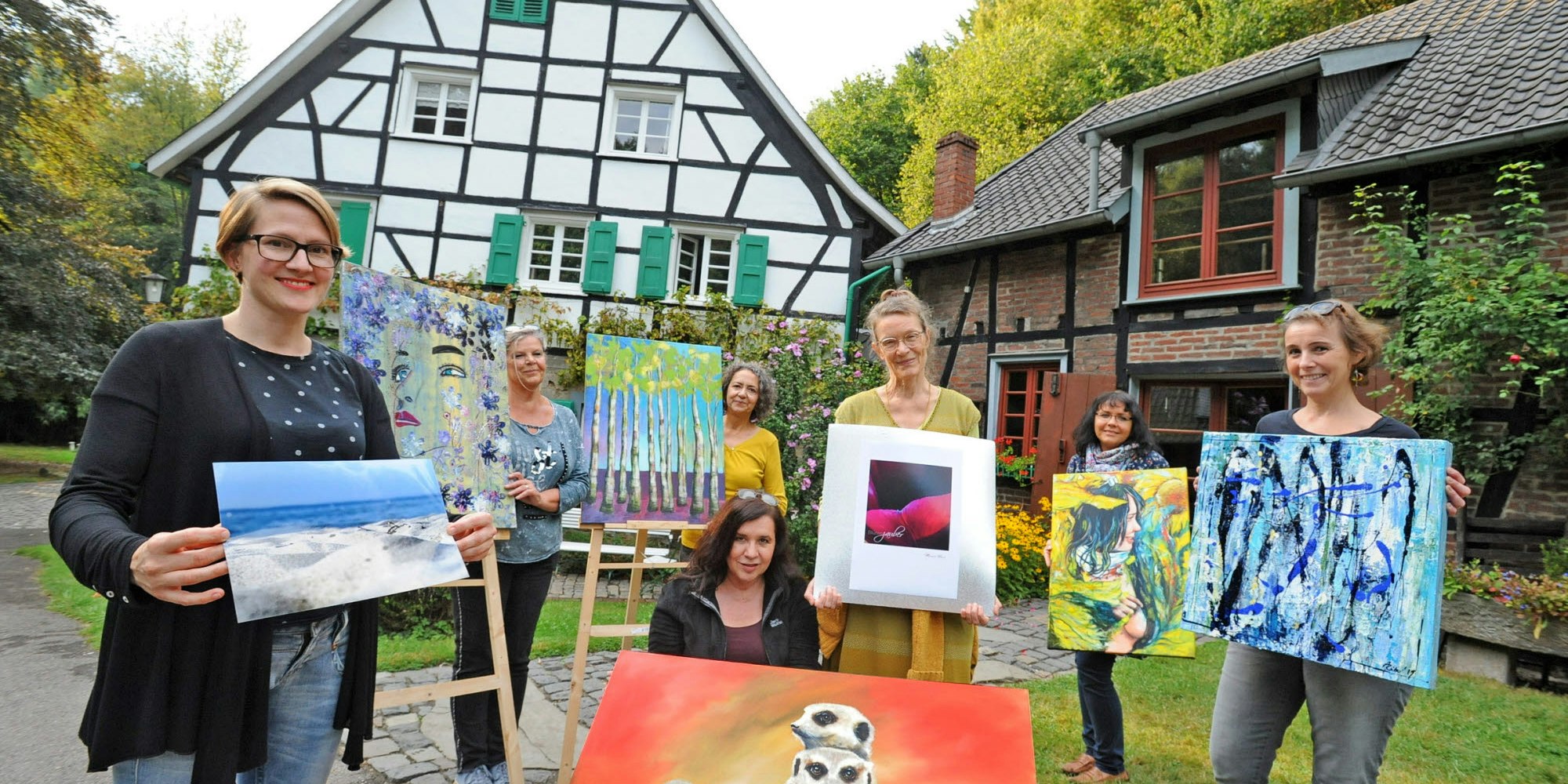 Ina Hartmann, Birgitt Negro, Birgit Bühle, Hanna Punte, Mariama Hense, Anna Czempik und Anja Rübo (von links) zeigen ihre Werke in der Lambertsmühle.