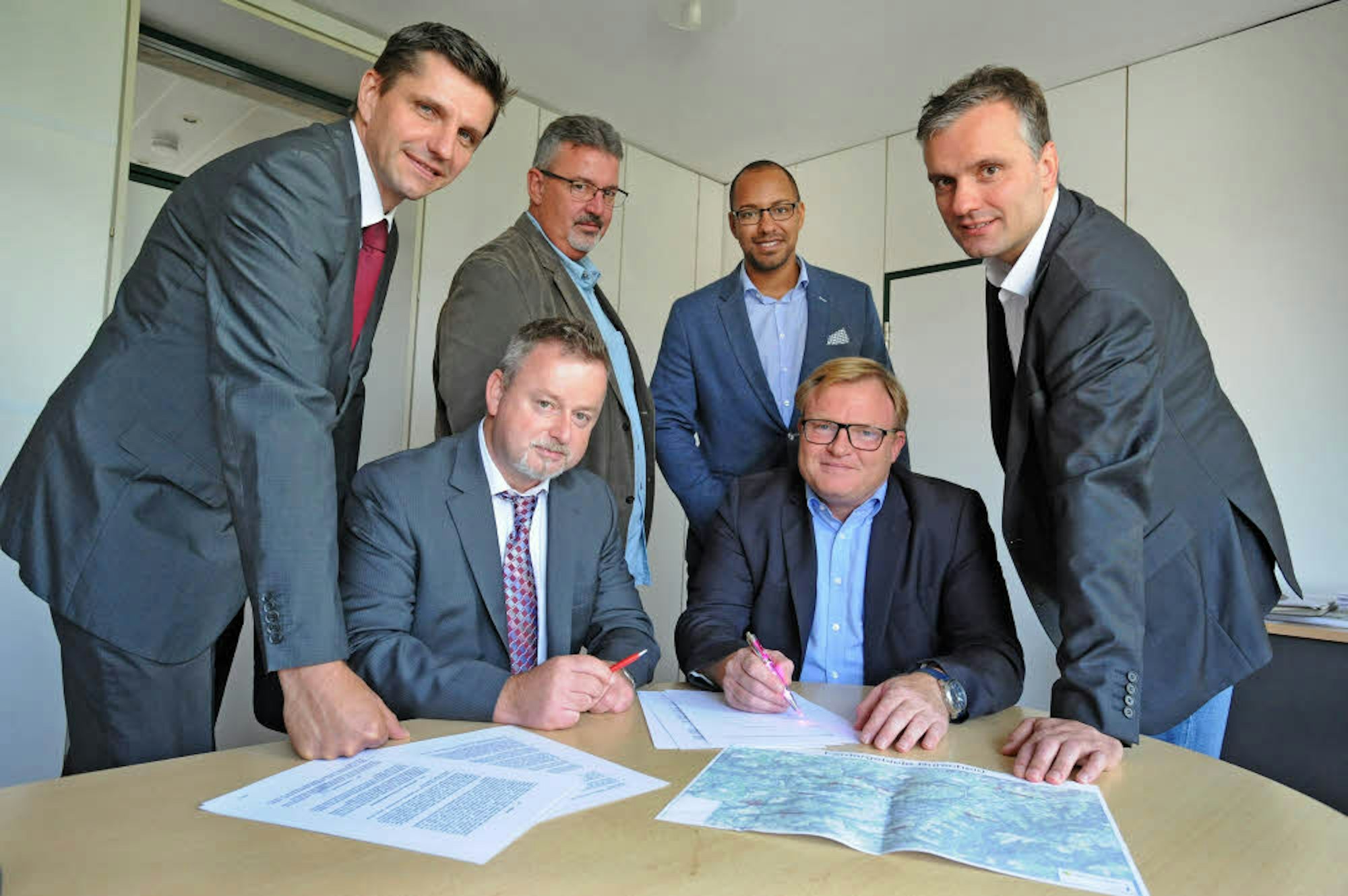 Unterzeichnen: Marco Lohmeier, Peter Kroppen, Stefan Caplan, Marc Baack (vorne) sowie Volker Lüders und Joel Trawally.
